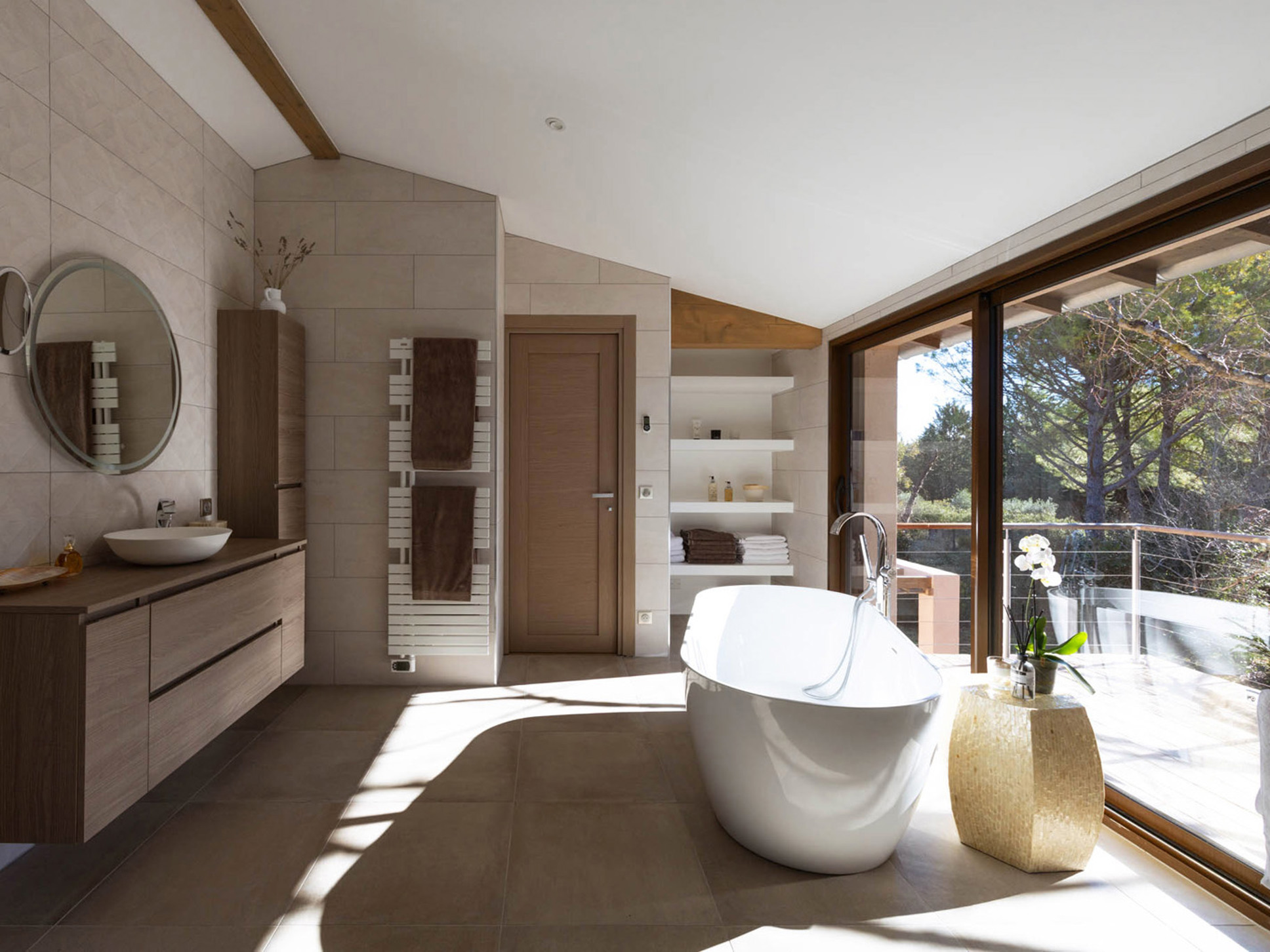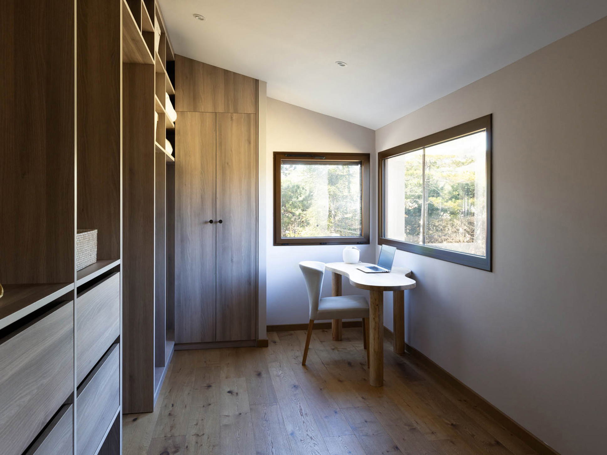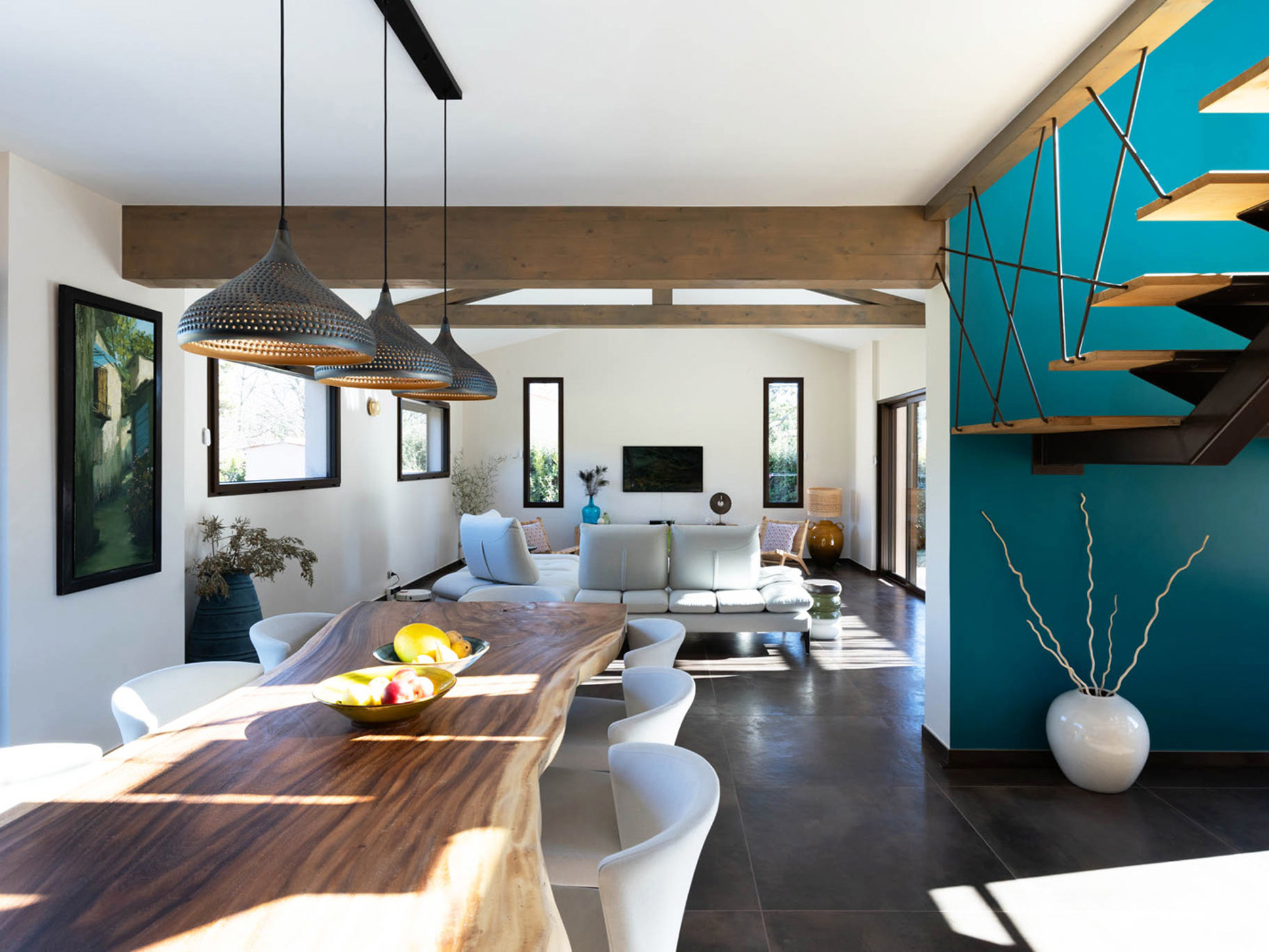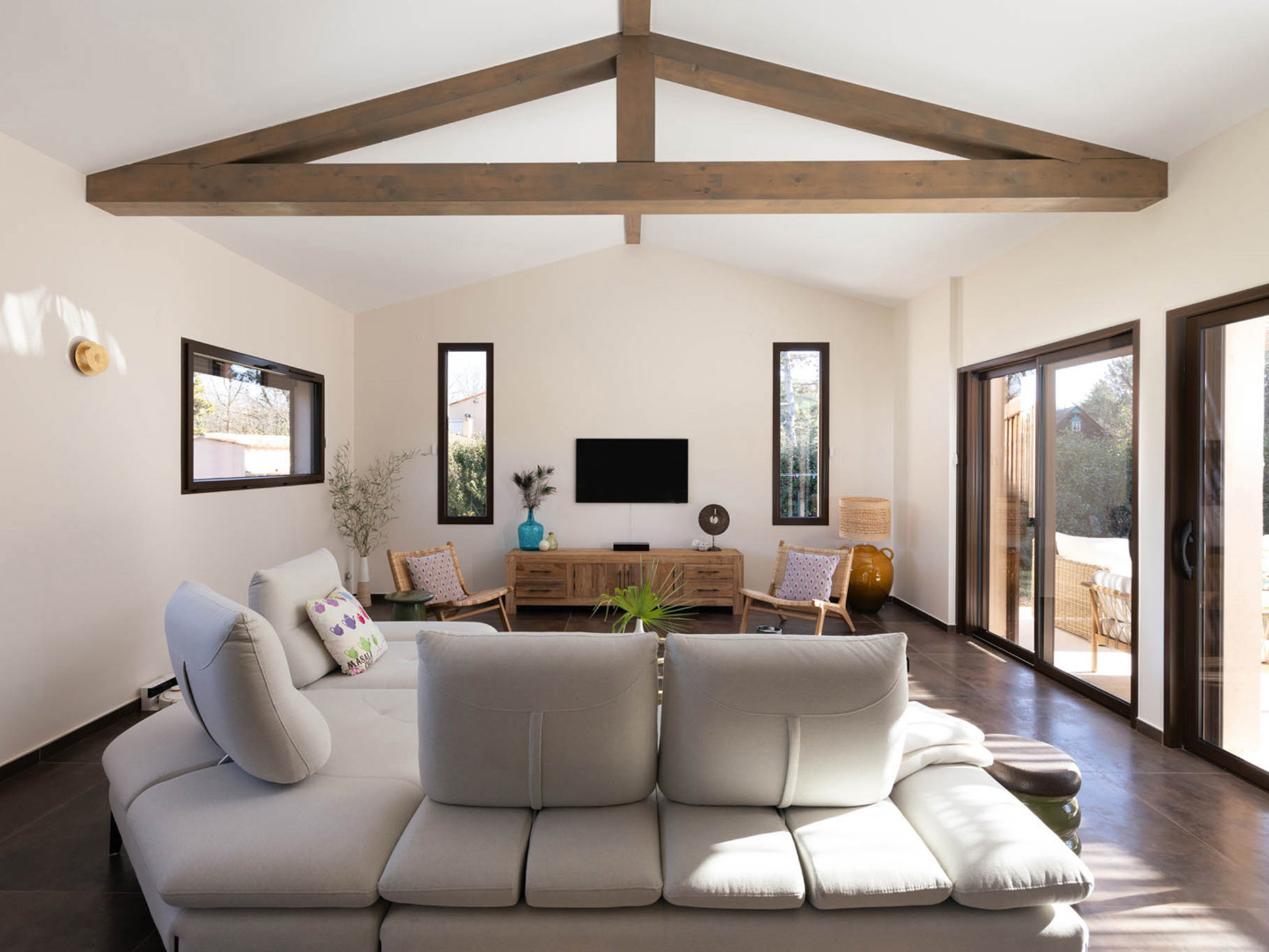 De living is licht en ruim, ingericht met stijlvolle designmeubelen en een comfortabele zithoek. Grote ramen zorgen voor een prettige verbinding met de buitenwereld en versterken de eigentijdse uitstraling.