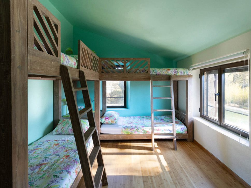 Slaapkamer 4: Een kinder slaapkamer naast slaapkamer 3. Hier staan twee mooie op maat gemaakte stapelbedden. Slaapkamers 3 en 4 delen een moderne badkamer met douche, wastafel en toilet.