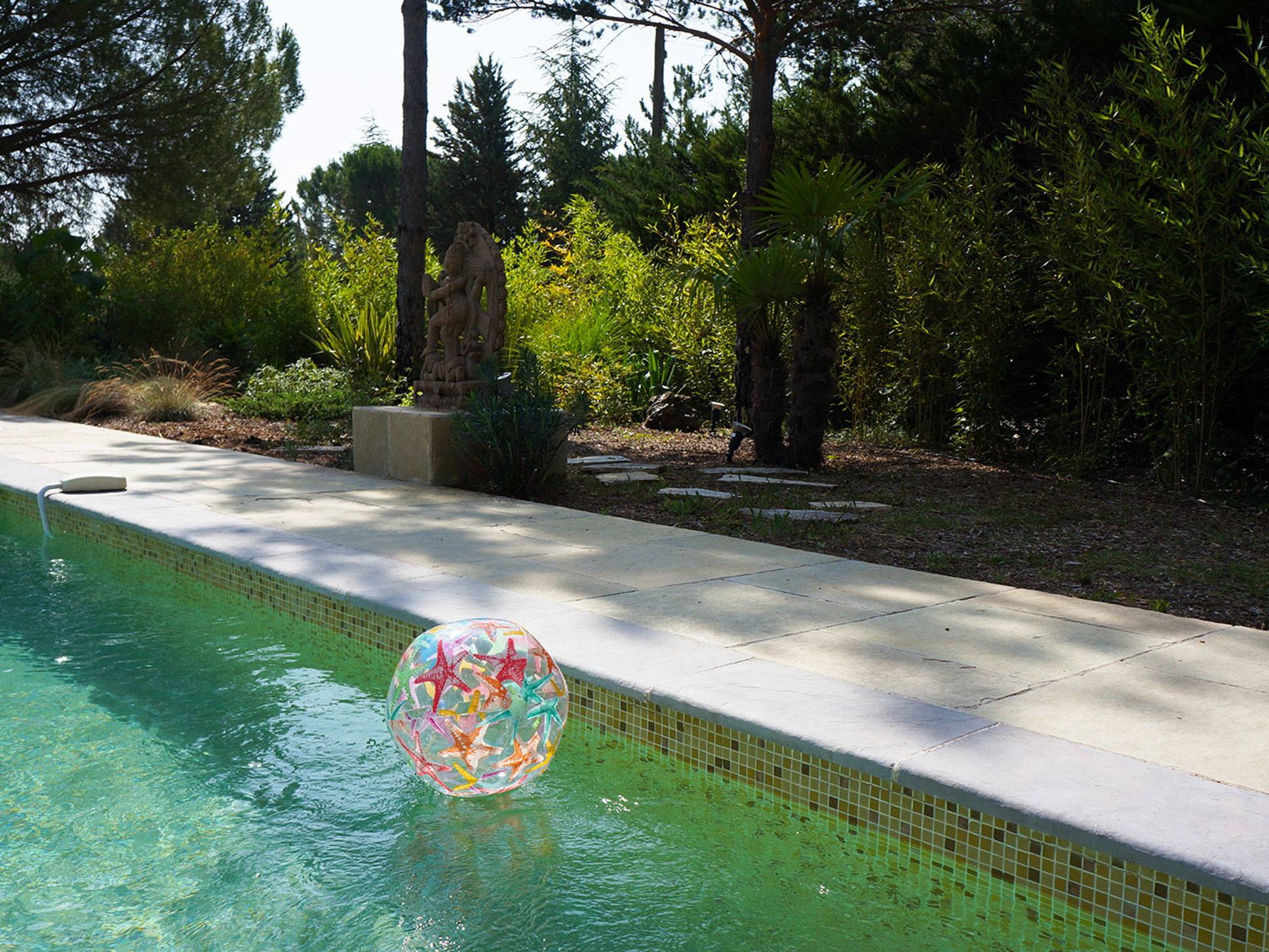 Het zwembad meet ongeveer 11 x 5 m. Geheel omringd door een prachtig natuurstenen terras. Er zijn comfy ligstoelen en parasols aanwezig. De grote aanwezigheid van bamboe biedt het geheel een licht Aziatisch tintje.