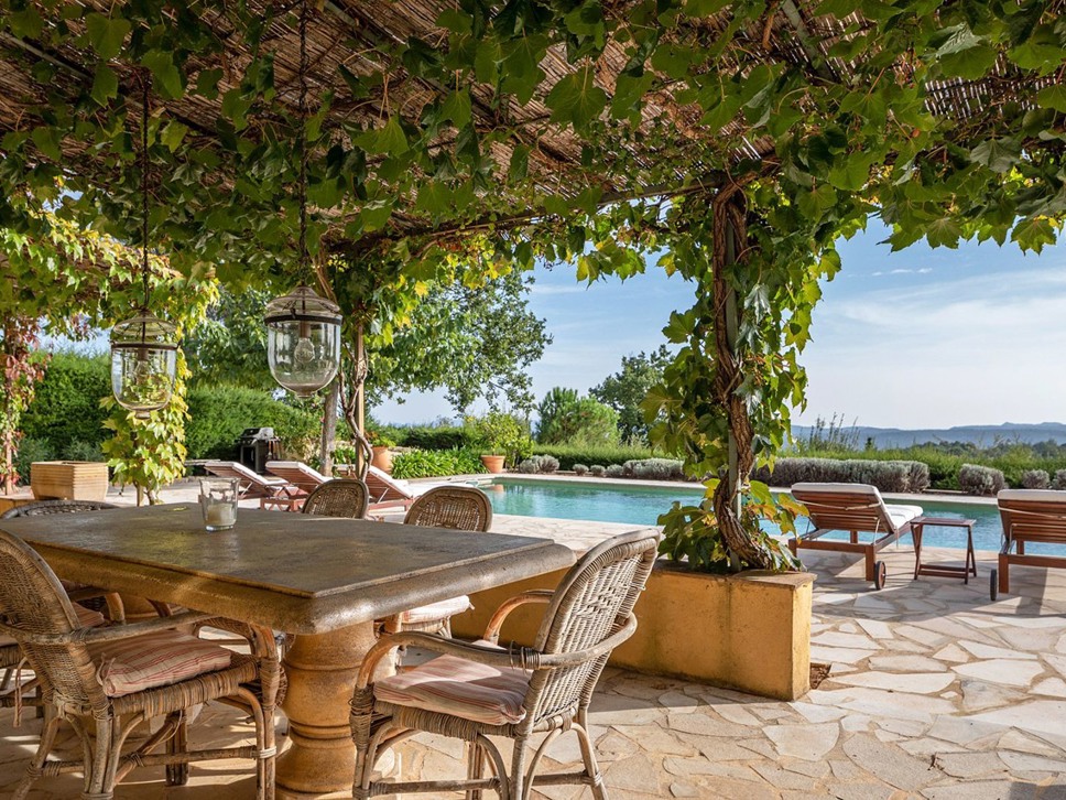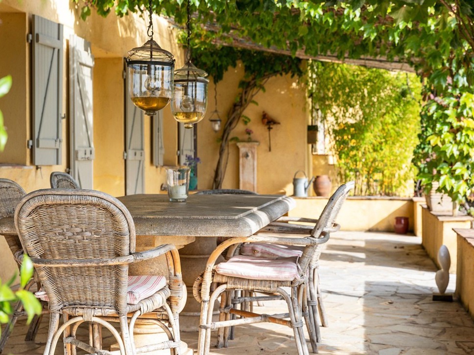 Het overdekte terras, aan de voorzijde van de villa, strekt zich uit over de gehele breedte van de villa. Hier staat een eettafel met 6 stoelen. U kunt hier heerlijk uit de zon zitten en genieten van het uitzicht op de Provençaalse heuvels. Een mooie plek voor een glas rosé, lunch of diner.