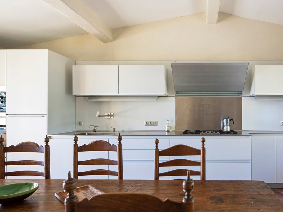 In het verlengde van de living bevindt zich de ruime woonkeuken. De keuken is modern van stijl en goed uitgerust; koelkast, oven, magnetron, vaatwasser en koffiezetapparaat. In de keuken is een grote eettafel aanwezig welke plaats biedt voor 8 personen.