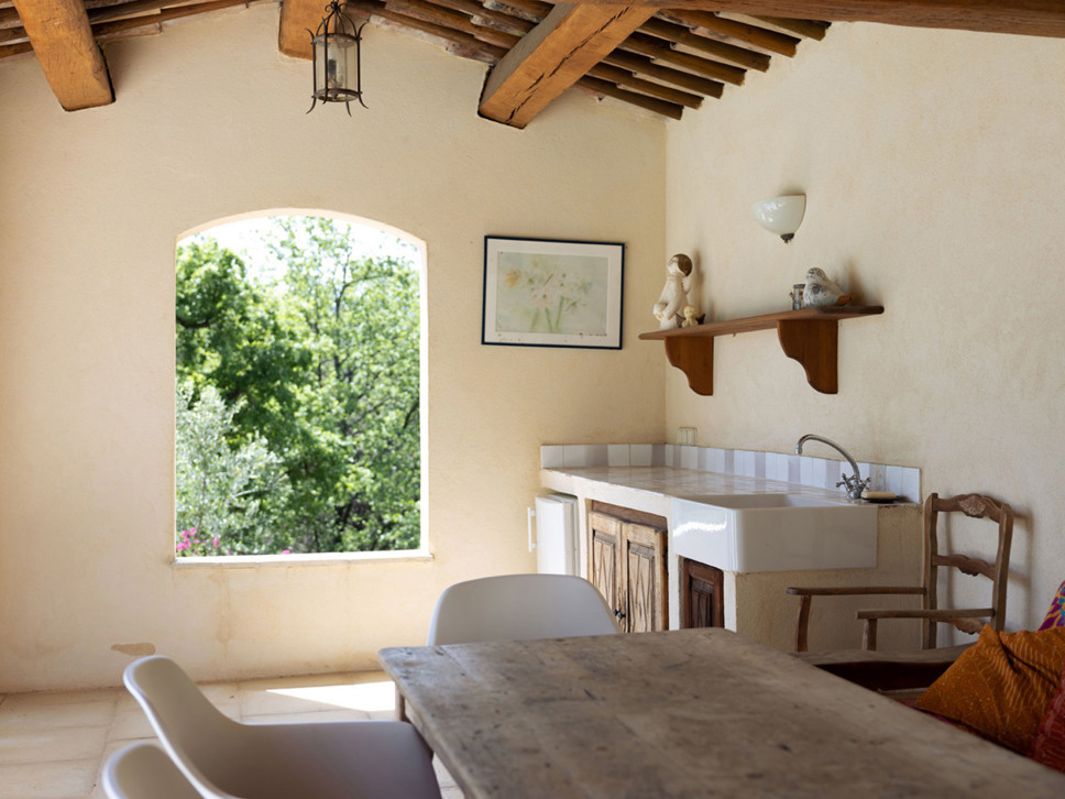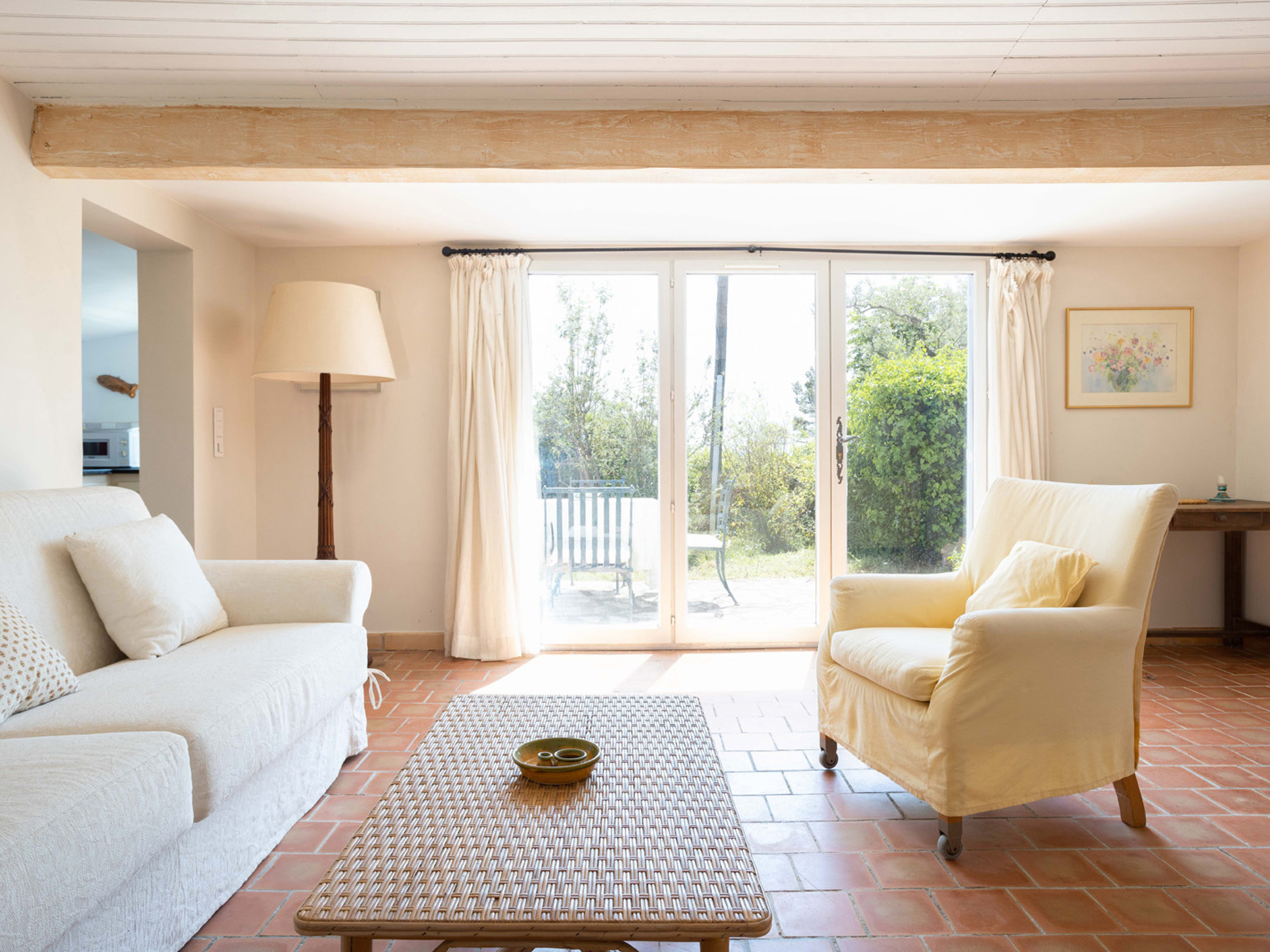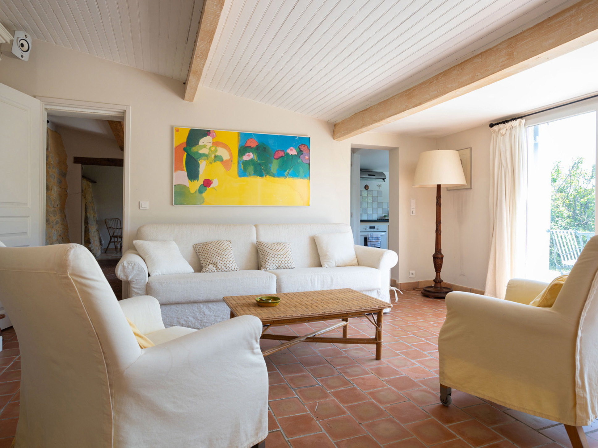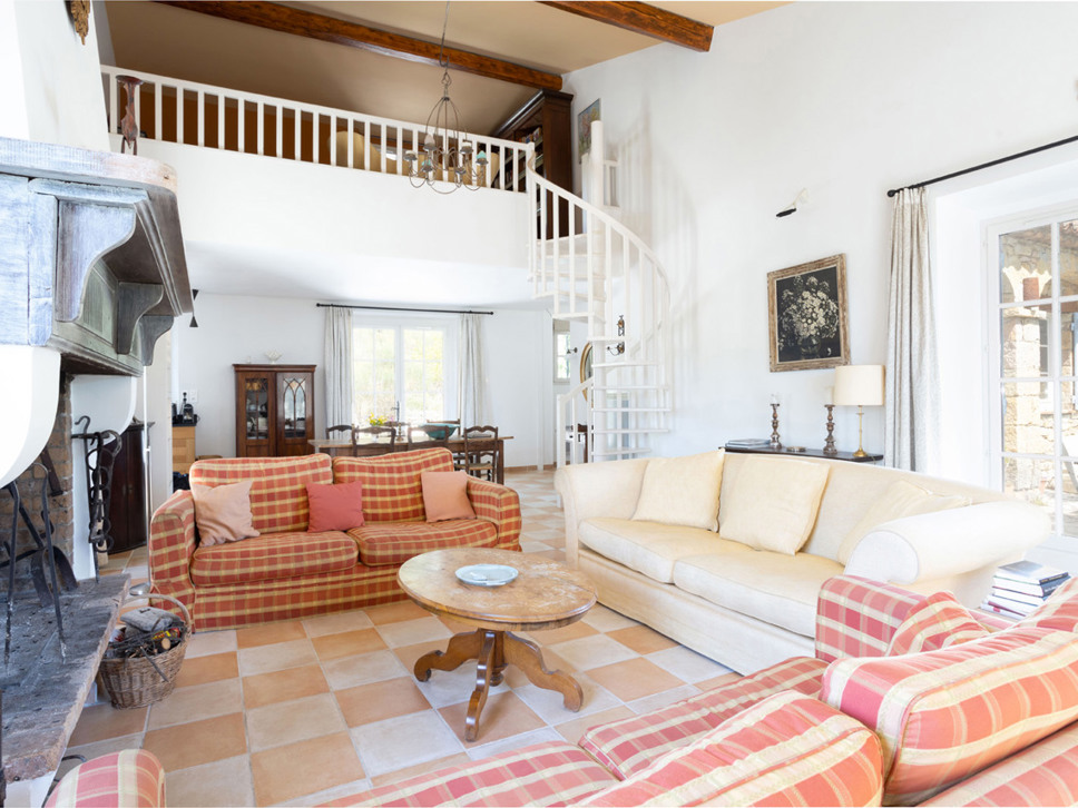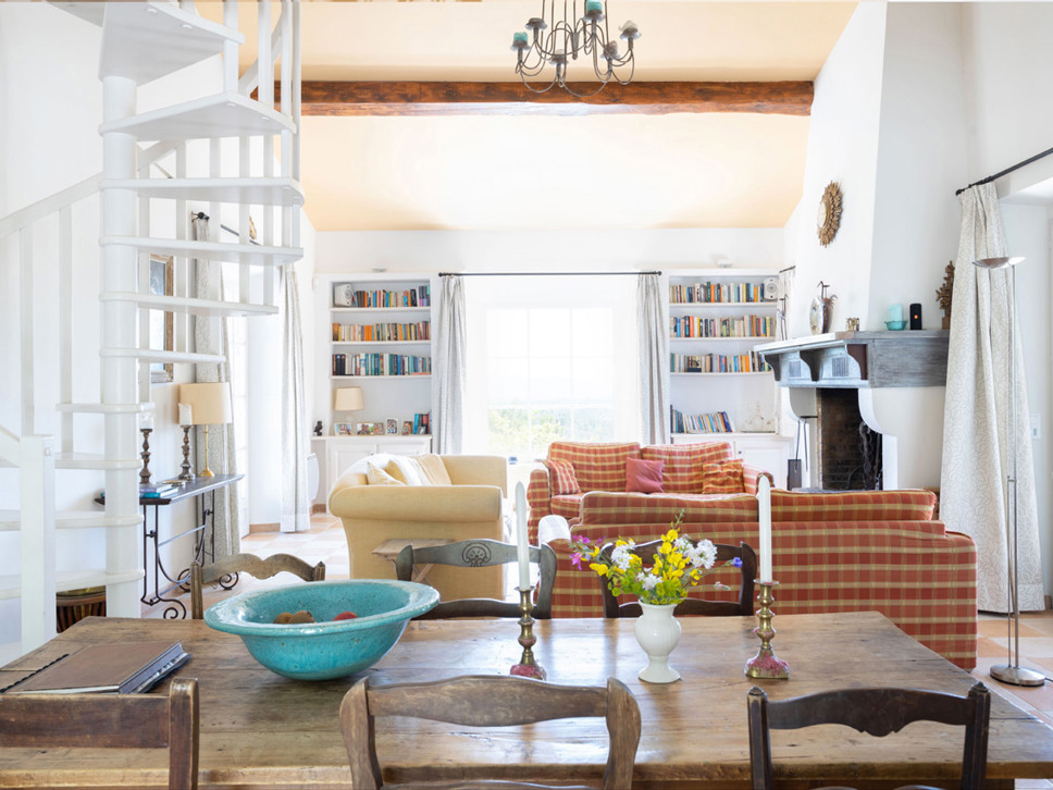 De woning heeft een ruime living met een comfortabele zithoek met open haard. De grote ramen bieden fraai uitzicht over de Provençaalse heuvels. Openslaande deuren geven toegang tot verschillende terrassen.