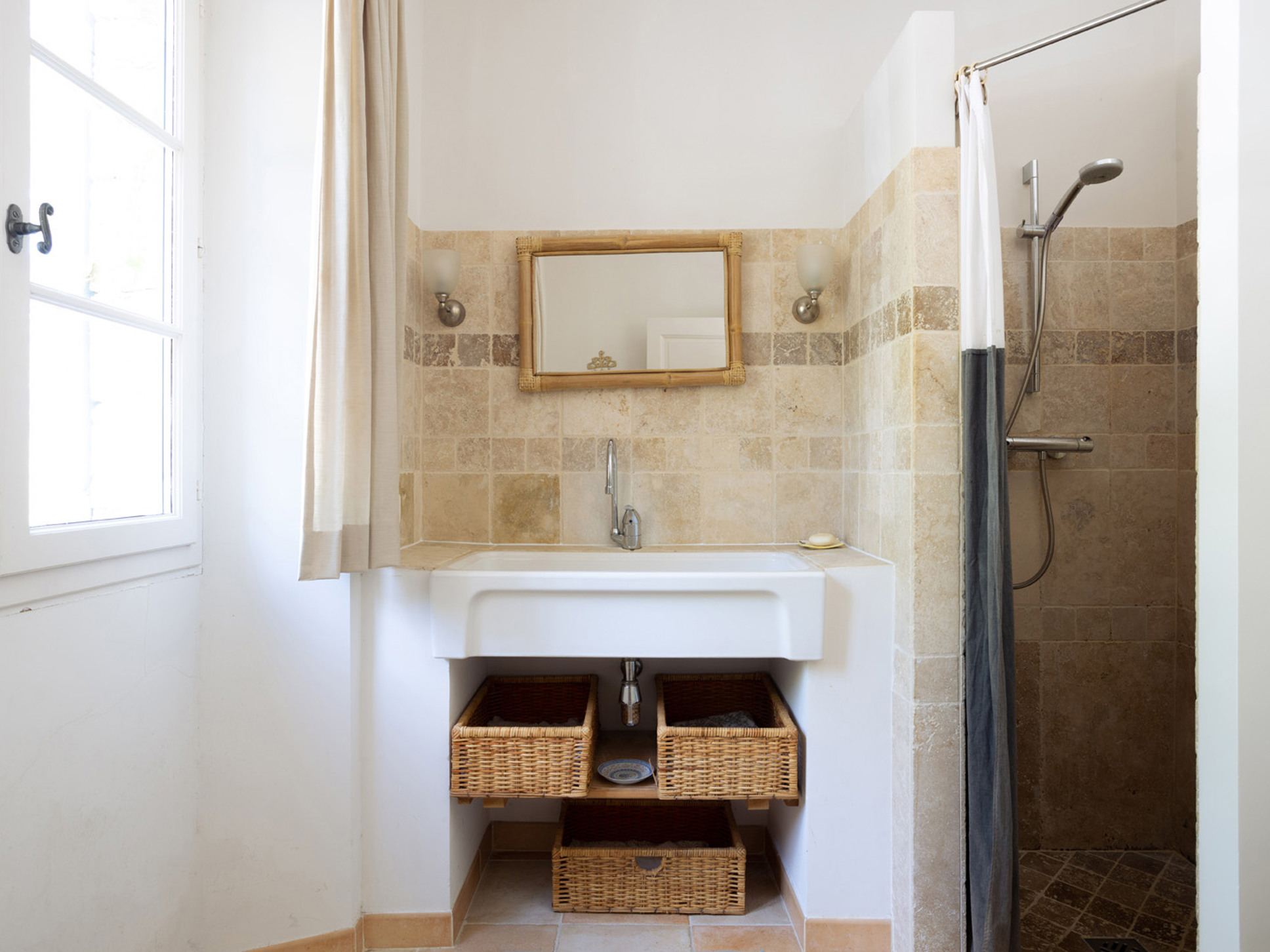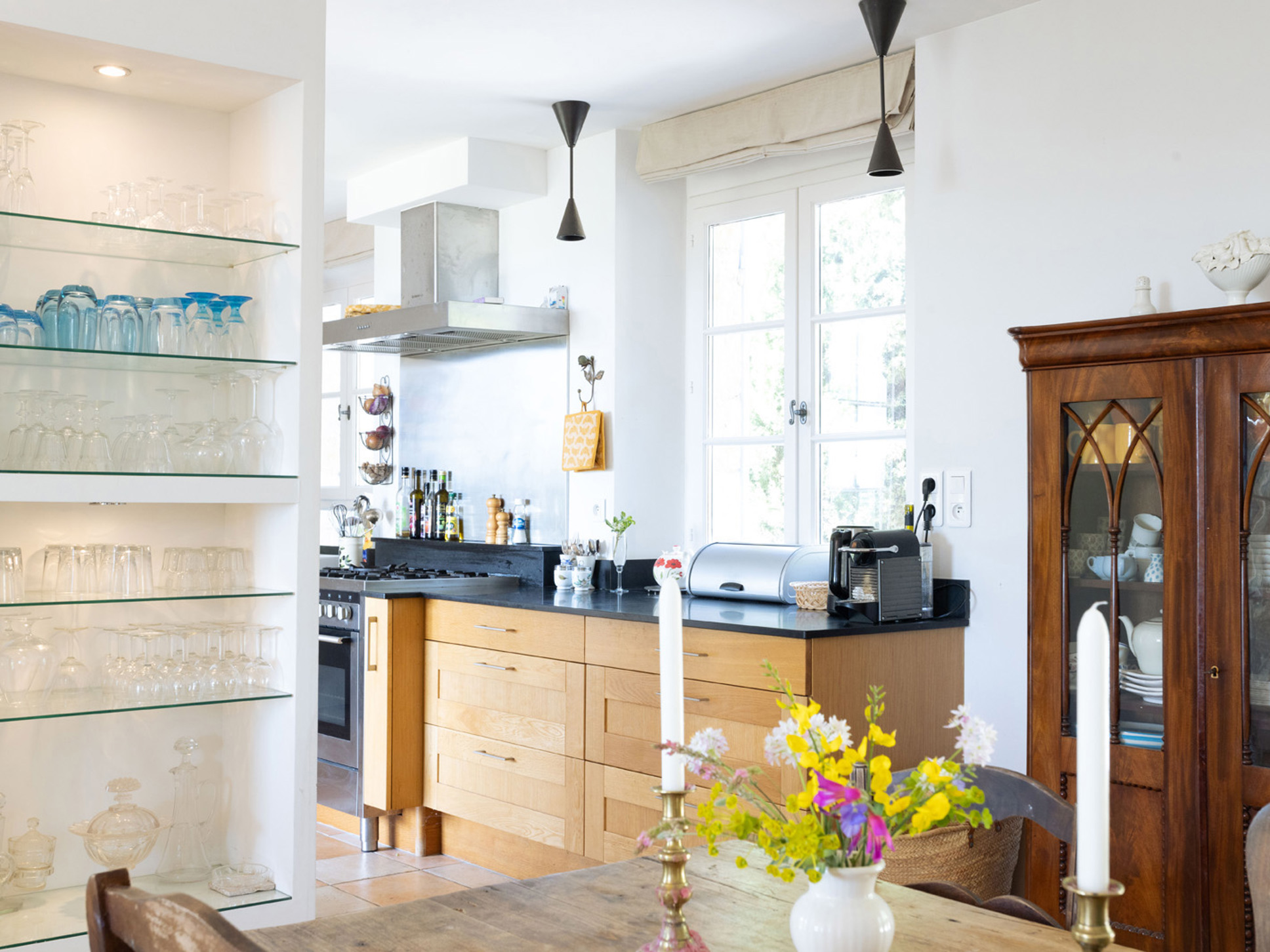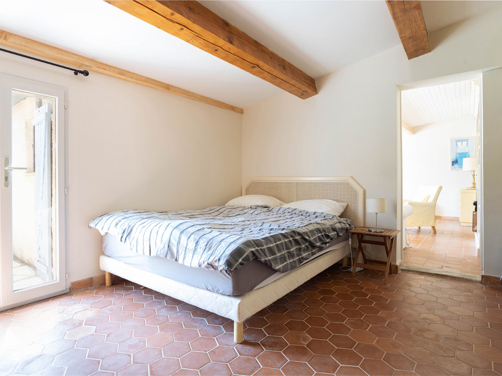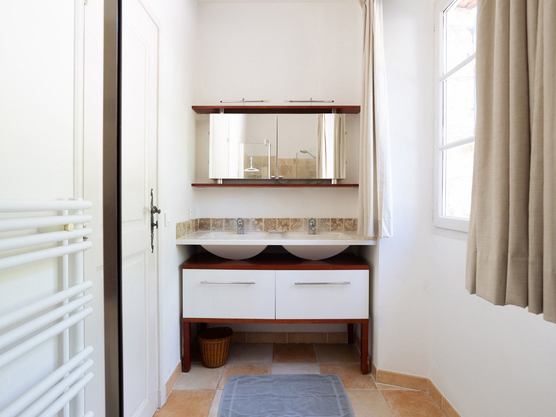 De woning heeft een ruime living met een comfortabele zithoek met open haard. De grote ramen bieden fraai uitzicht over de Provençaalse heuvels. Openslaande deuren geven toegang tot verschillende terrassen.