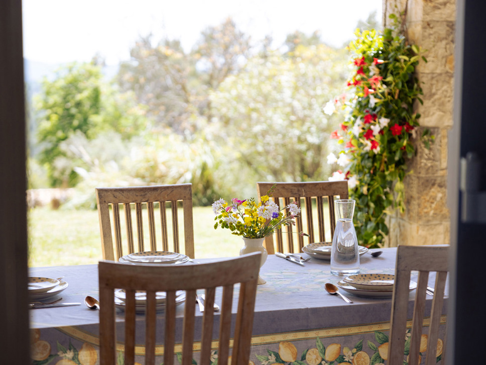 Vanuit het dorp Fayence rijdt u in ca 5 minuten naar de villa. Het laatste stukje over een eigen oprit tussen de fruitbomen door. Er is meer dan voldoende ruimte voor het parkeren van meerdere auto’s. Op het overdekte terras bij de openslaande deuren staat de buiten eettafel. Een heerlijke plek voor lunch of diner. Aan de andere zijde van de living ligt een 2e terras met ook hier een uitschuifbare eettafel (10 pers) alsook ligstoelen en vanwaar een fraai uitzicht op de Provençaalse heuvels en het dorp Fayence.