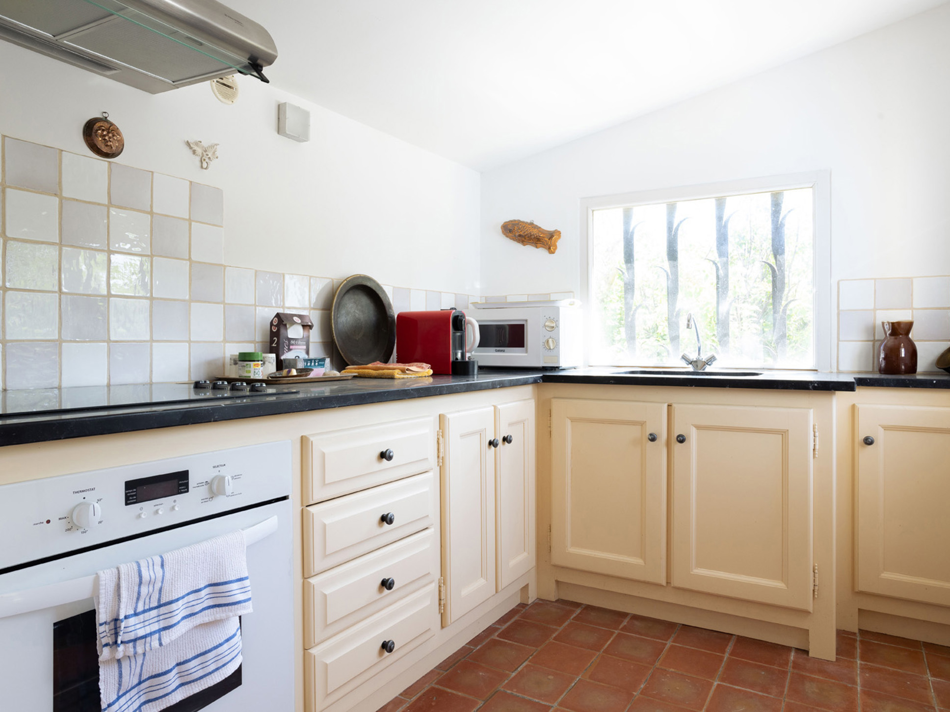 Er is een open, luxe keuken voorzien van alle nodige apparatuur waaronder een grote Amerikaanse ijskast en vriezer, afwasmachine, magnetron maar ook zaken als een cafetiere, ijsmaker, toaster, en een vruchtenshaker. Een trap in de living leidt naar een vide waar een televisiehoek is gemaakt. In de villa liggen cd's, elpee's en vele gezinspellen.