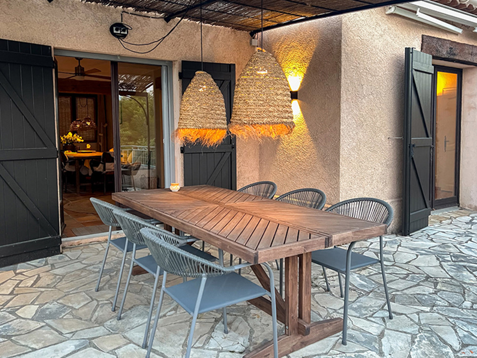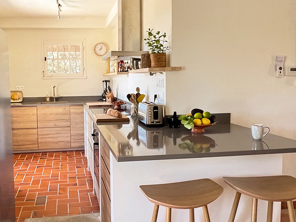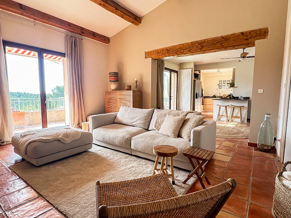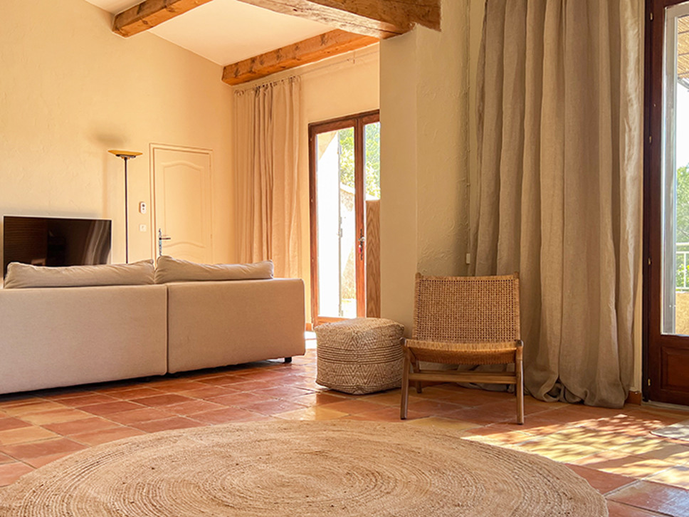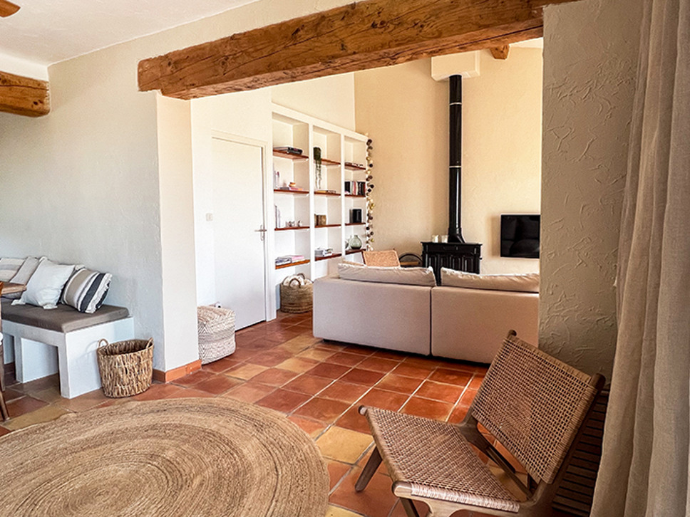 Wanneer u de woning binnenstapt ademt u de sfeer van Zuid-Frankrijk in. Het interieur is een sfeervolle combinatie van traditionele houten balken, terracotta kleur vloer en eigentijdse meubels in aardetinten. De eetkamer staat in open verbinding met de open keuken en de living. Vanuit de eetkamer is er een directe toegang naar het deels overdekte terras. Zowel in de woonkamer als de eetkamer zijn plafondventilatoren.