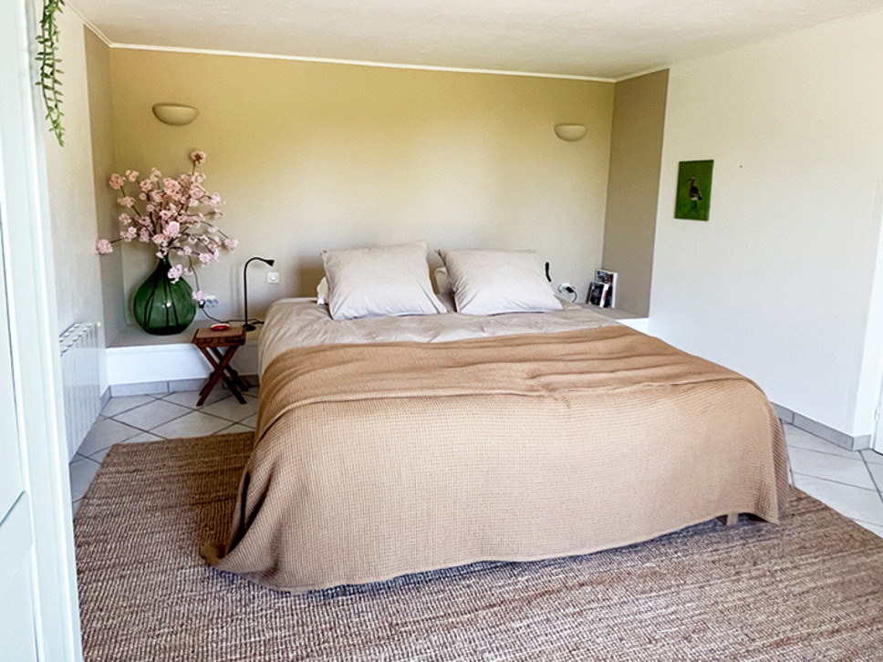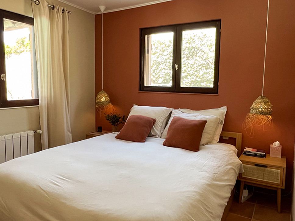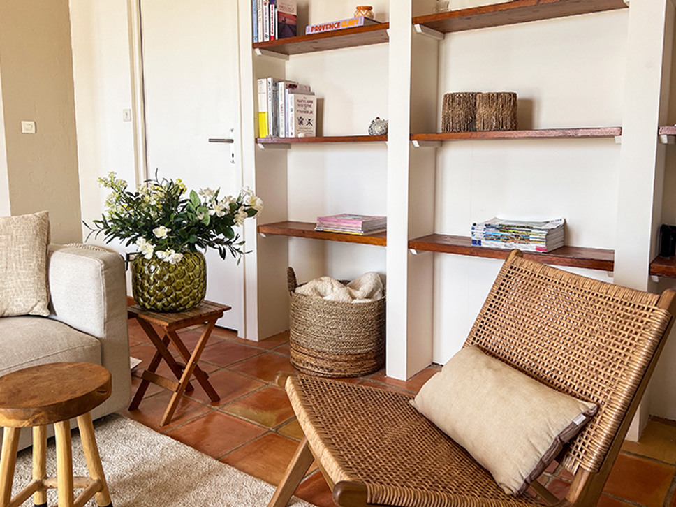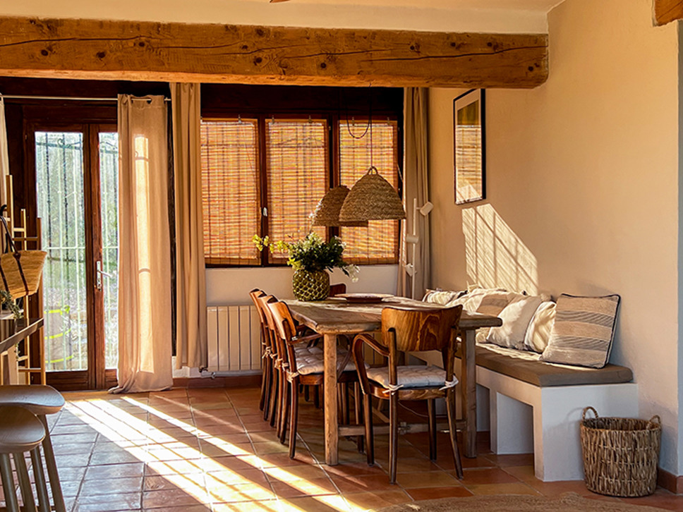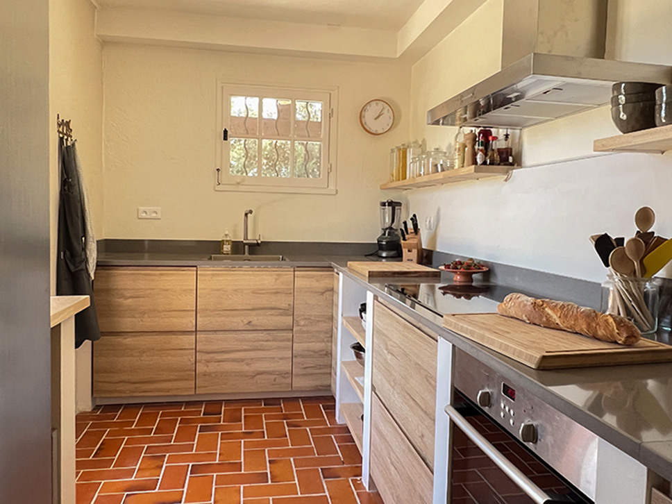 Wanneer u de woning binnenstapt ademt u de sfeer van Zuid-Frankrijk in. Het interieur is een sfeervolle combinatie van traditionele houten balken, terracotta kleur vloer en eigentijdse meubels in aardetinten. De eetkamer staat in open verbinding met de open keuken en de living. Vanuit de eetkamer is er een directe toegang naar het deels overdekte terras. Zowel in de woonkamer als de eetkamer zijn plafondventilatoren.