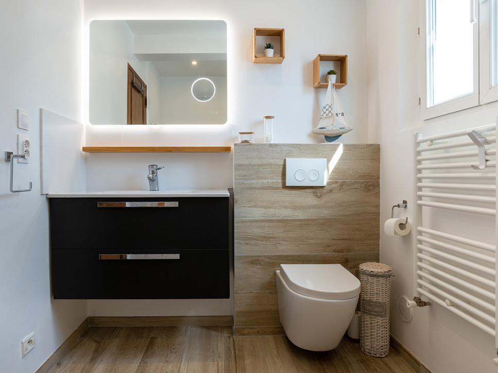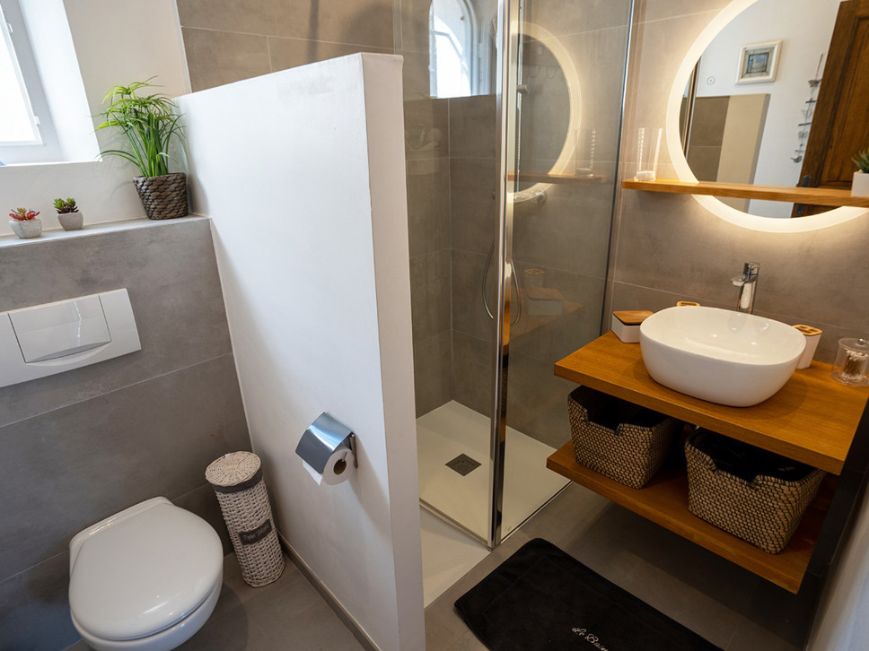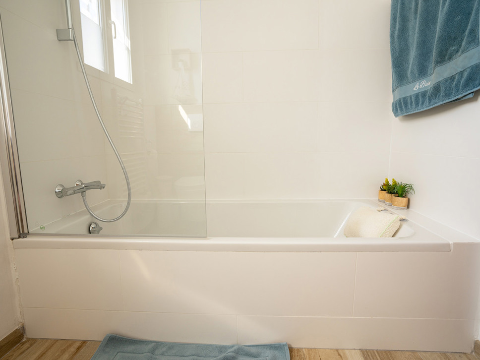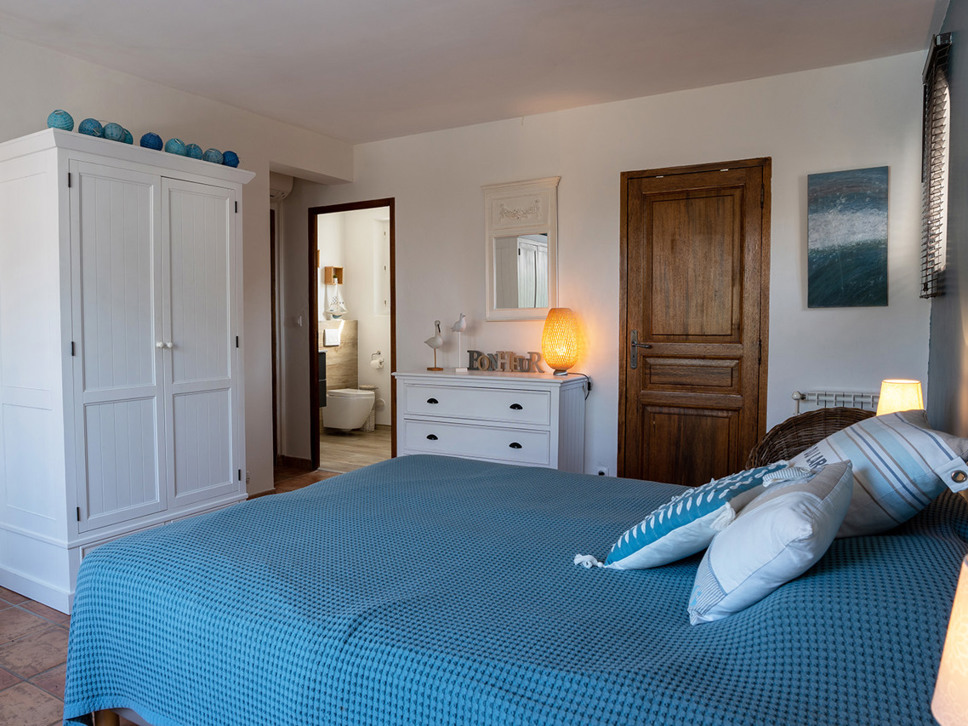Vanuit de living komt u, via enkele treden, bij de trap die u naar de eerste verdieping brengt. Hier bevindt zich slaapkamer 4, de master bedroom. Deze slaapkamer heeft een tweepersoonsbed (160x200) en een en-suite badkamer (douche en toilet).