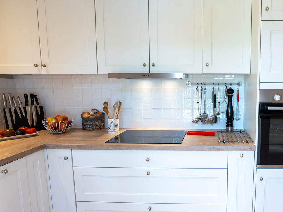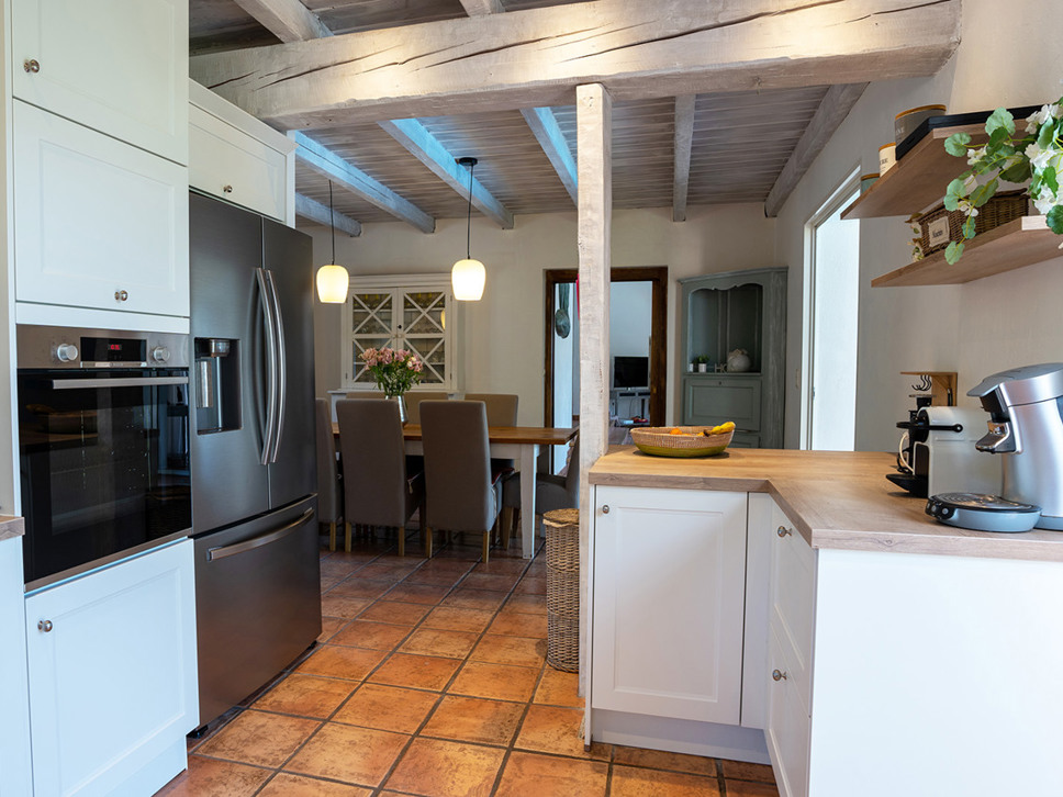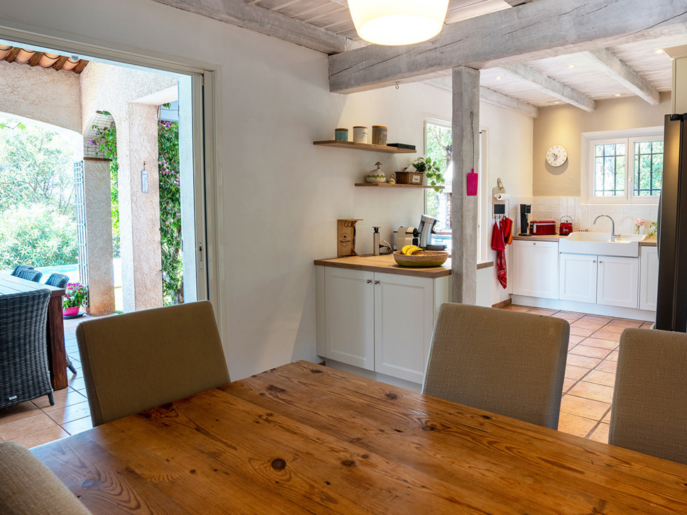 Aangrenzend aan de living is de eetkamer met de open keuken. In de eetkamer staat een grote Provençaalse tafel welke plaats biedt aan 8 personen. De open keuken beschikt over alle voorzieningen; o.a. een vaatwasser, oven, magnetron en een koelkast. Uiteraard ontbreekt een koffiezetapparaat niet, om de dag met een vers kopje koffie te beginnen. Via een schuifdeur heeft u direct toegang tot het terras.