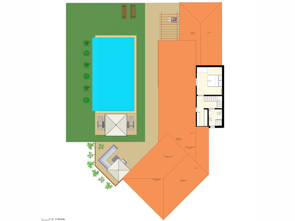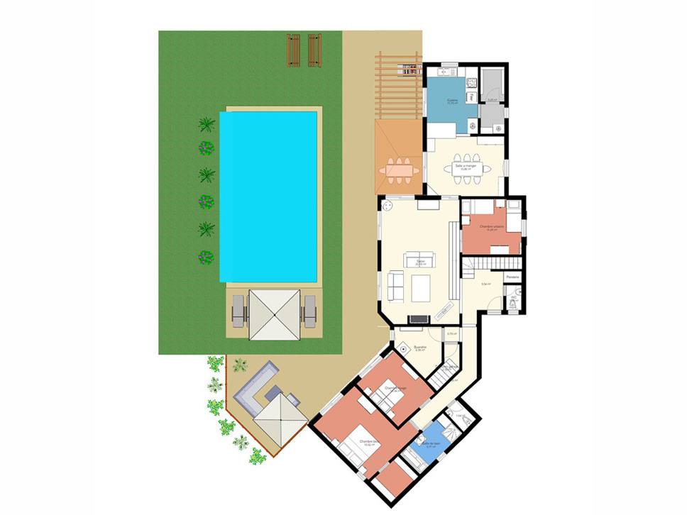 Het zwembad (10,5 x 5 m) ligt centraal in de tuin en beschikt over romeinse trappen en een zogenoemd plage. Ideaal met kinderen zodat ze in ondiep water kunnen spelen. Naast al het groen om het zwembad is er ook een zonneterras met 4 luxe ligstoelen en parasols. Op een verhoging is een tweede zonneterras waar nog eens 2 luxe ligstoelen staan, een parasol en 2 lounge stoelen.