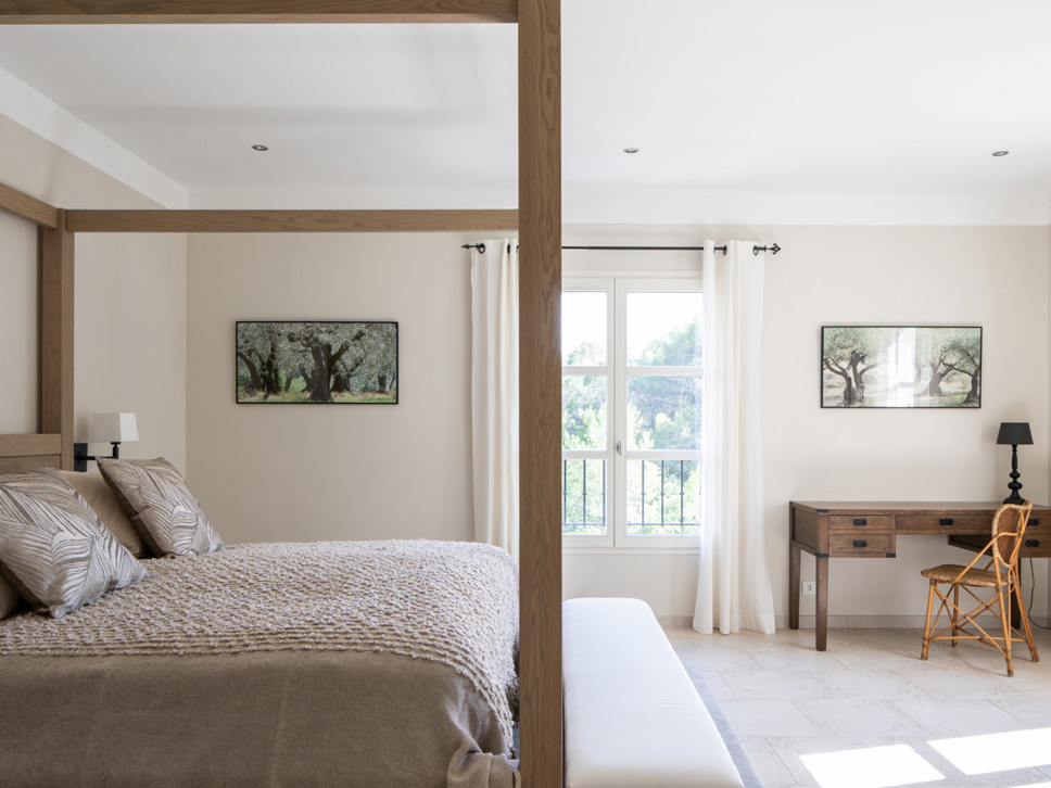 Slaapkamer 4, (begane grond, andere zijde villa). Voorzien van een tweepersoons boxspringbed (180x200 cm). De badkamer wordt gedeeld met slaapkamer 3 en beschikt over douche en toilet.