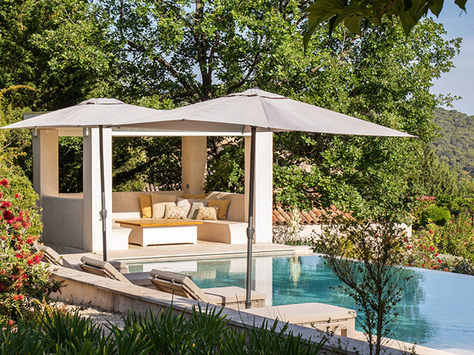 Privézwembad. Het zwembad is voorzien van een infinity pool overflow. Het is overal even diep (1.50m) en heeft een afmeting van 10 x 5 meter omgeven door een ruim fraai betegeld zonneterras. Luxe ligstoelen en parasols zijn aanwezig. De villa is georiënteerd op het zuiden en heeft de hele dag zon. Erg leuk vinden we de overdekte loungeset met de dikke kussens aan de kop van het zwembad.