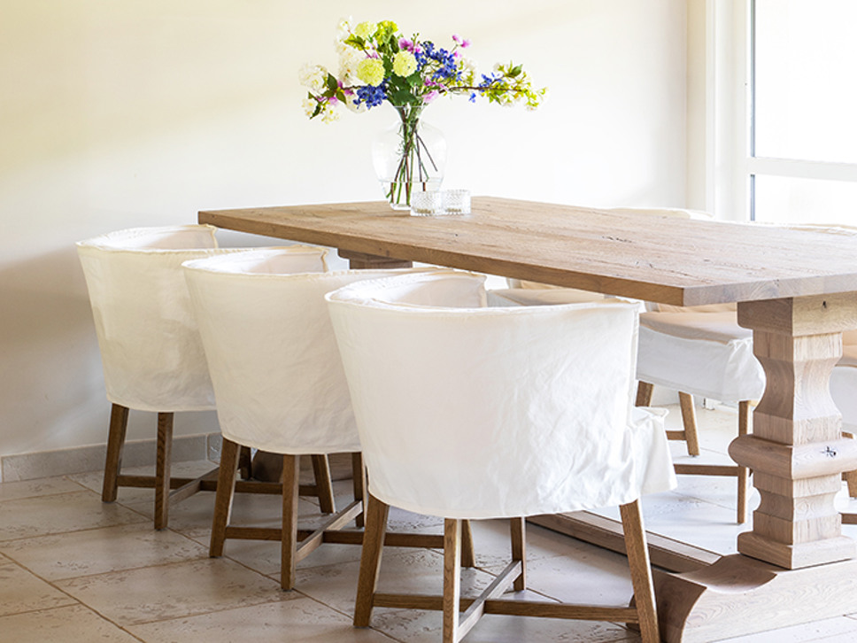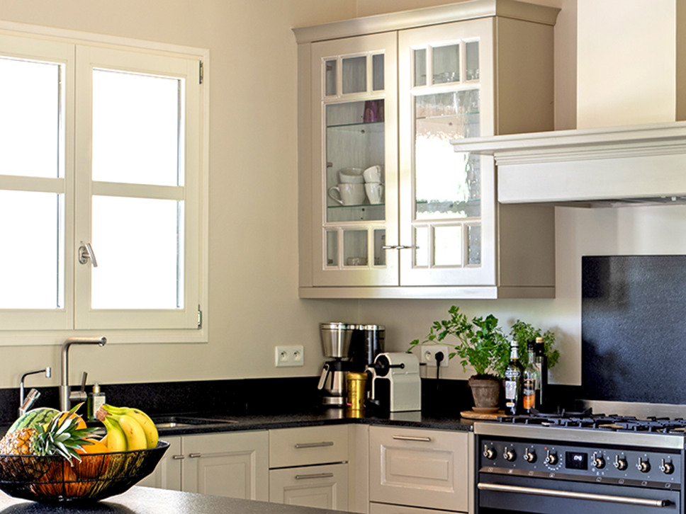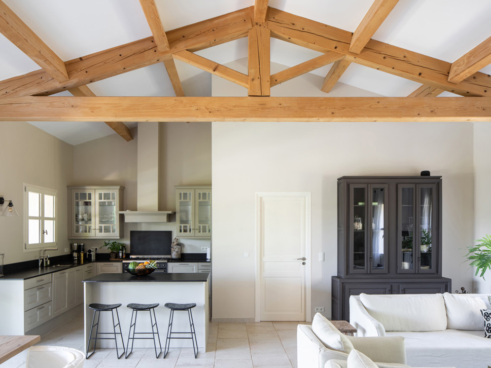 Deze luxe en sfeervol gerenoveerde villa biedt een royale open living met moderne keuken. De inrichting is licht en rustig van kleur, waarbij de authentieke houten balken in het plafond direct voor sfeer zorgen. De zithoek is comfortabel ingericht en de stijlvolle eettafel biedt plaats aan zes personen. De keuken is modern en van alle gemakken voorzien.