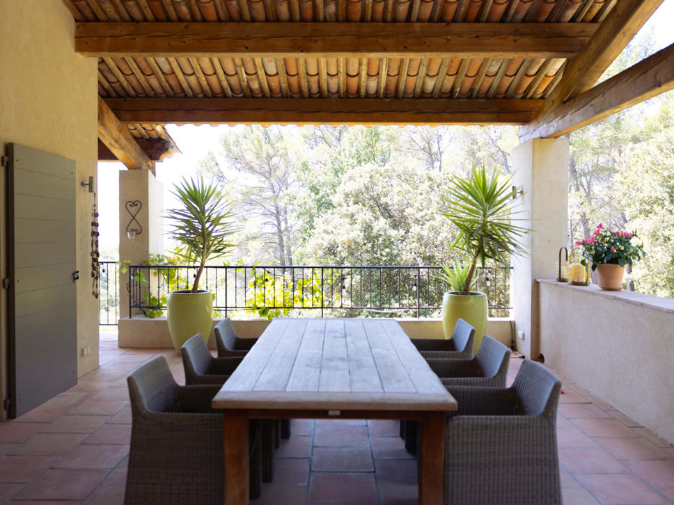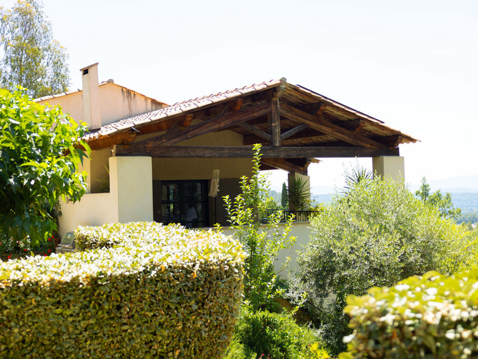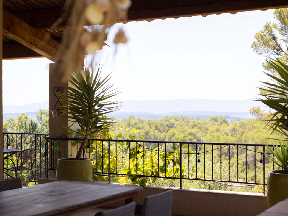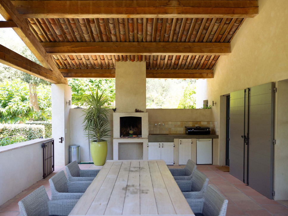 Zowel vanuit de living als vanuit de keuken heeft u direct toegang tot het L-vormige overdekte terras. Het terras heeft verschillende zitjes, van hieruit heeft u een prachtig uitzicht over Lorgues en de omgeving. Op dit terras staat ook een grote eettafel met stoelen en een buitenkeuken, voorzien van een plancha en een kolen BBQ / open haard. Heerlijk tafelen met uitzicht!
