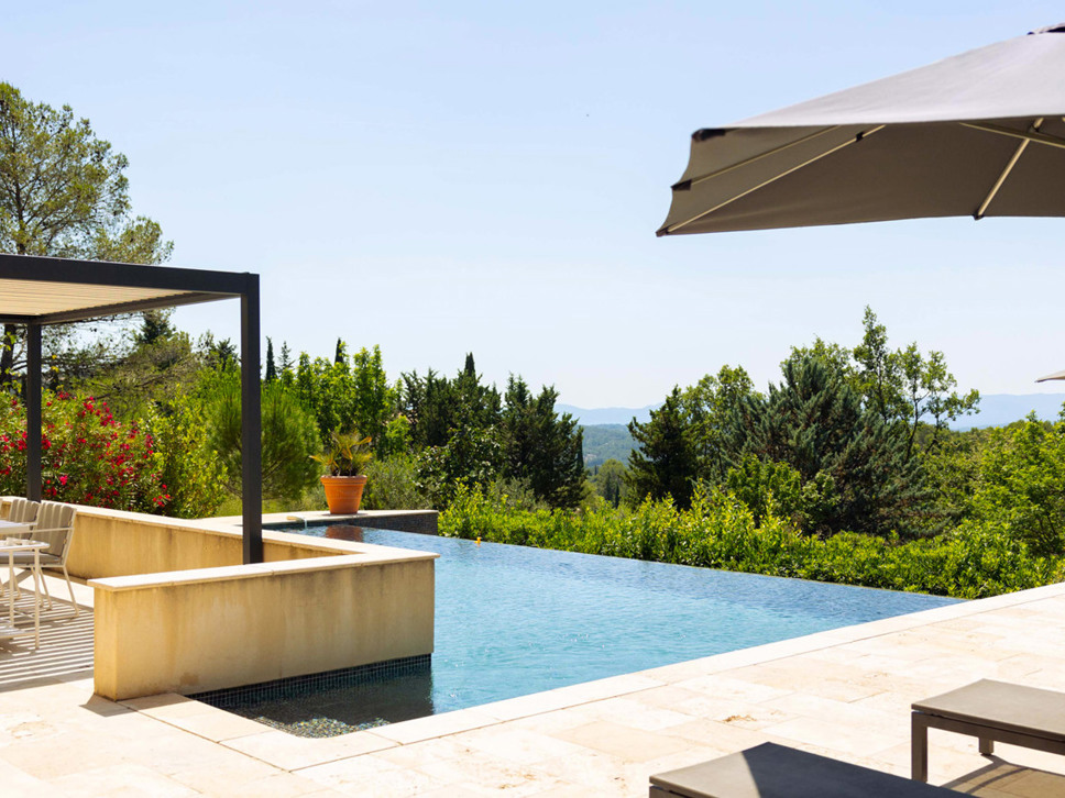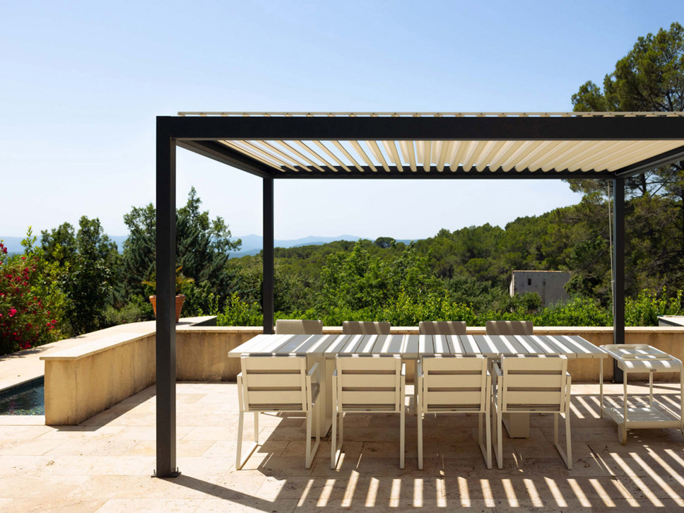 Temidden van het terras, aan de achterzijde van het zwembad, staat een grote eettafel met voldoende stoelen onder een moderne pergola. het dak van deze pergola kan zowel open als dicht. U kunt dus zowel in de zon als in de schaduw genieten van het prachtige uitzicht over de tuin en de omliggende heuvels.