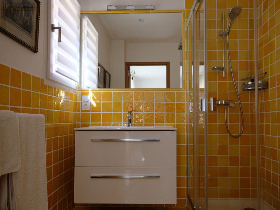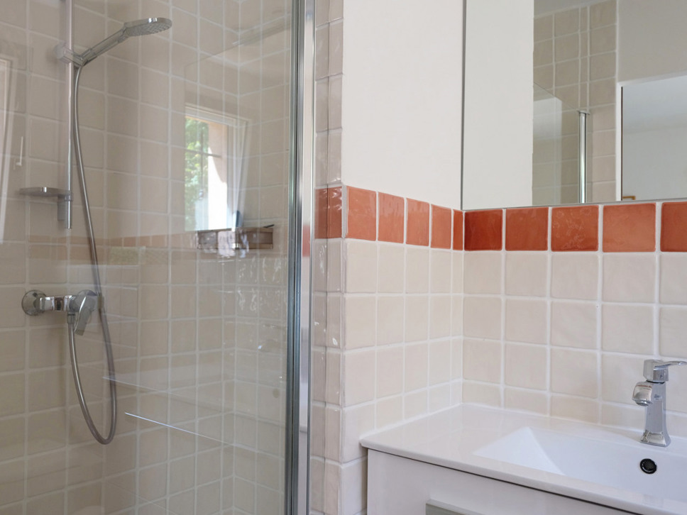 Slaapkamer 3 (eerste verdieping), ook hier staat een tweepersoonsbed (180x200). De en-suite badkamer biedt een douche, wastafel en toilet.