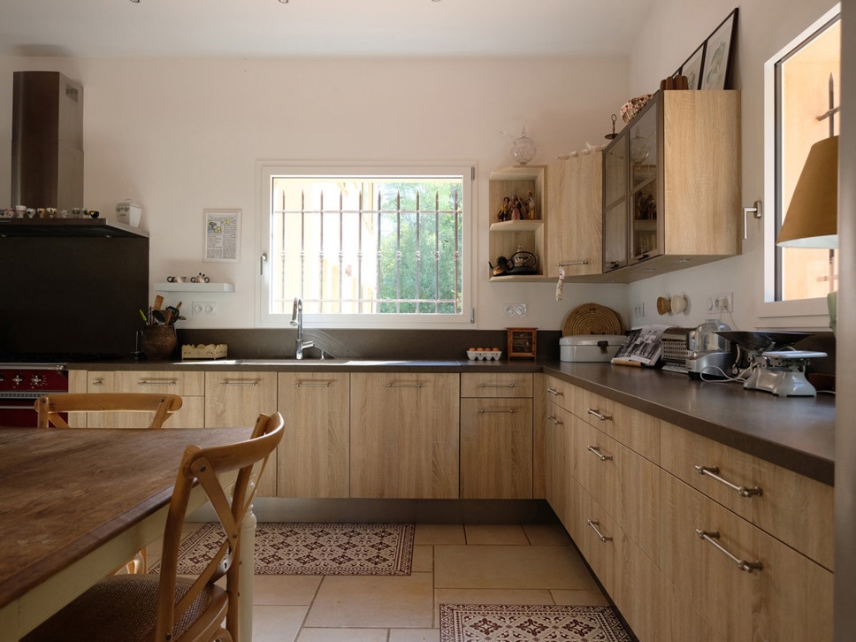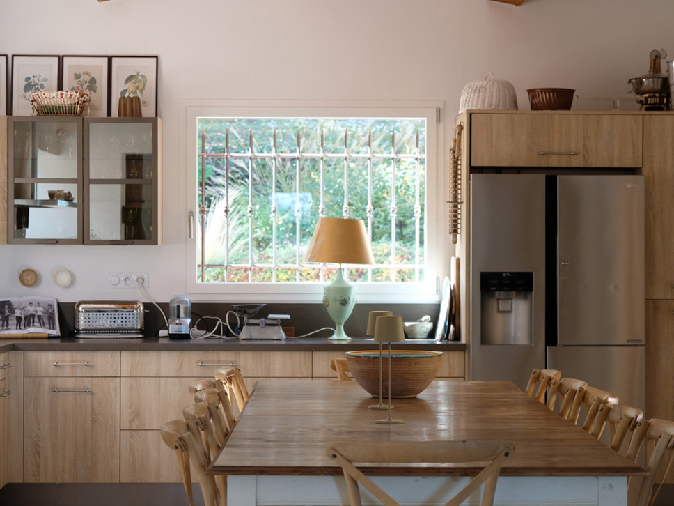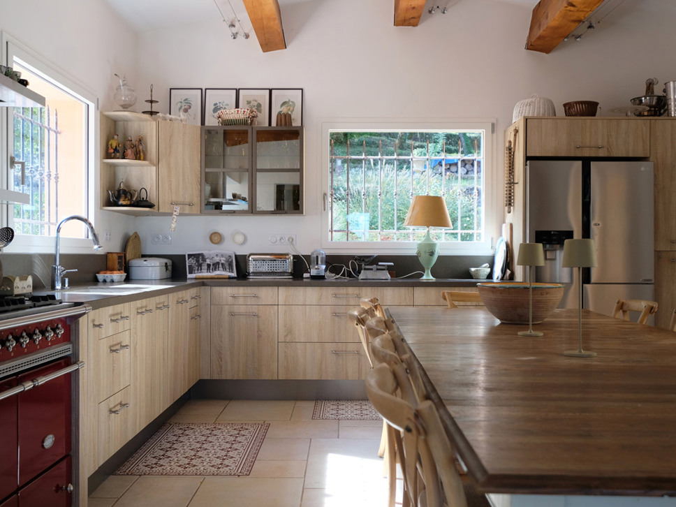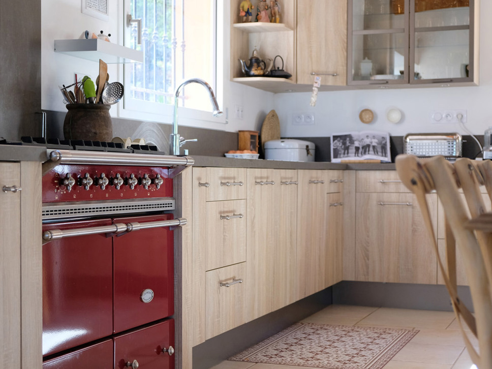De keuken is een echte leefkeuken, met als blikvanger het prachtige rode Lacanche fornuis. Aan de royale eettafel is ruimte voor tien personen. De keuken is zeer compleet uitgerust met moderne apparatuur en alle benodigdheden om uitgebreid te koken en samen te genieten van lange diners.