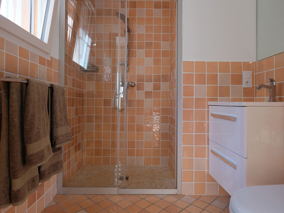 Slaapkamer 2 (eerste verdieping), voorzien van een tweepersoonsbed (180x200) en een en-suite badkamer met douche, wastafel en toilet.