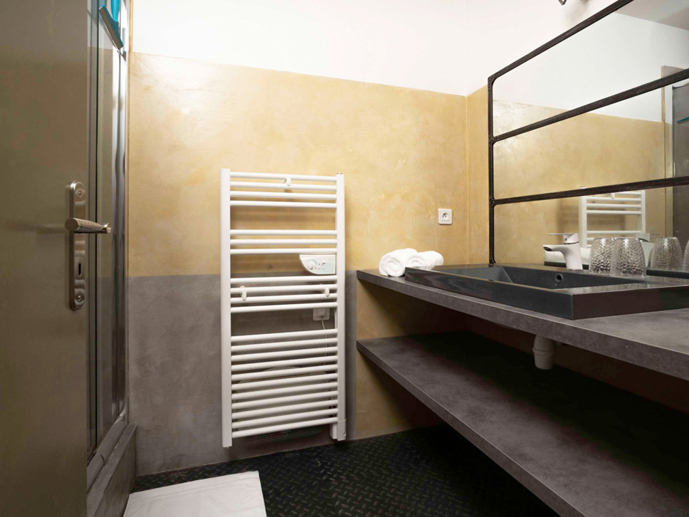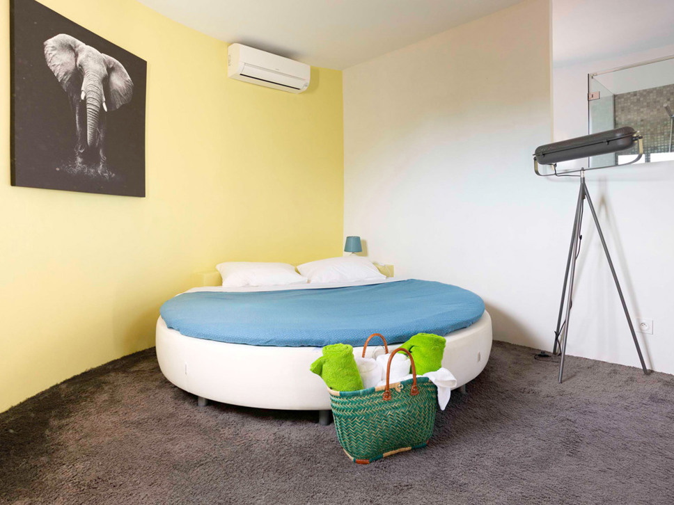 Slaapkamer 3 heeft een rond bed met een diameter van 2 meter. De badkamer is en-suite (douche, wastafel en toilet). deze kamer bevindt zich in de toren, een niveau hoger.