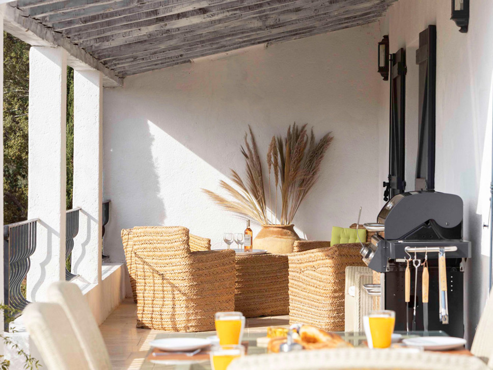 De onder architectuur gebouwde villa bestaat uit 2 niveaus. Op het niveau van de living en keuken bevindt zich een terras over de gehele lengte van de villa. Op het terras staat een leuke eigentijdse loungeset, alsook sunloungers, de BBQ en een eettafel. ER is hier ook een zonneluifel zodat u ook uit de zon kunt genieten van het terras. Op het terras bij de benedenverdieping staat een bistroset.