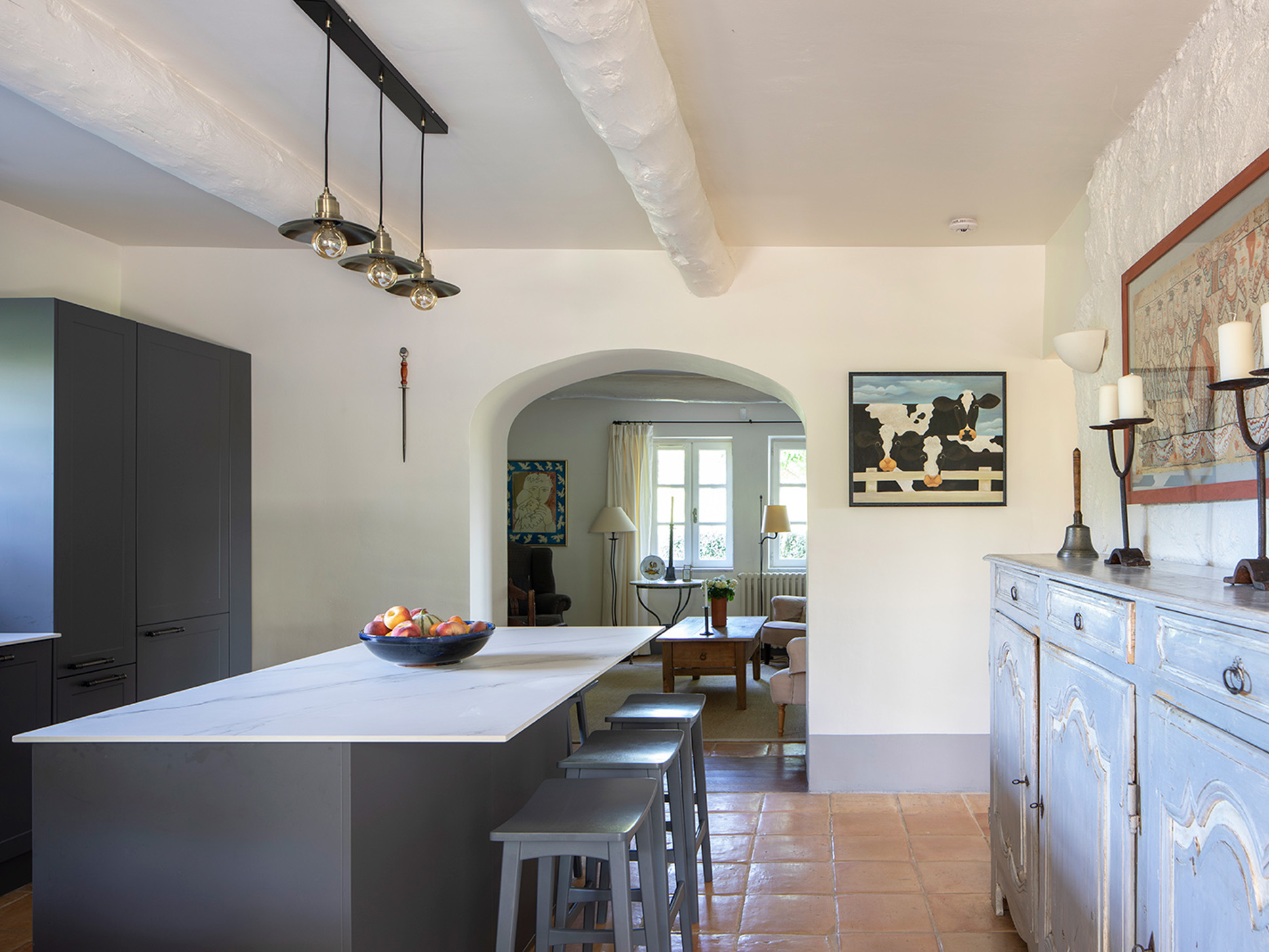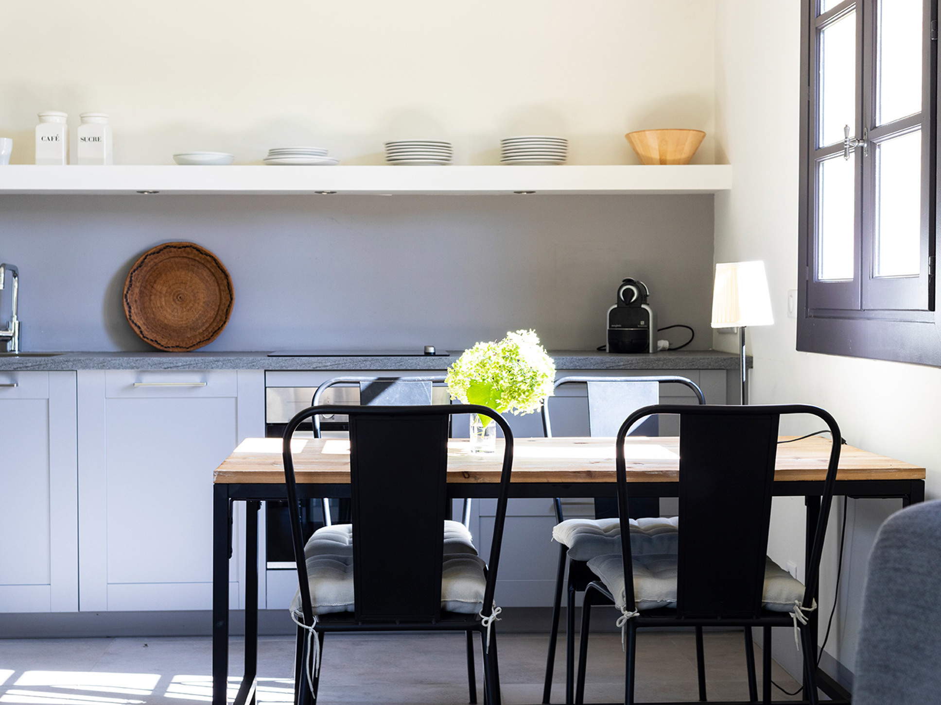 De moderne keuken is luxe uitgerust en voorzien van een oven, een magnetron, een luxe espresso machine, afwasmachine, koelkast/vriezer en een inductie kookplaat. Open deuren bieden toegang tot het deels overdekte terras met uitzicht op de tuin en het zwembad.