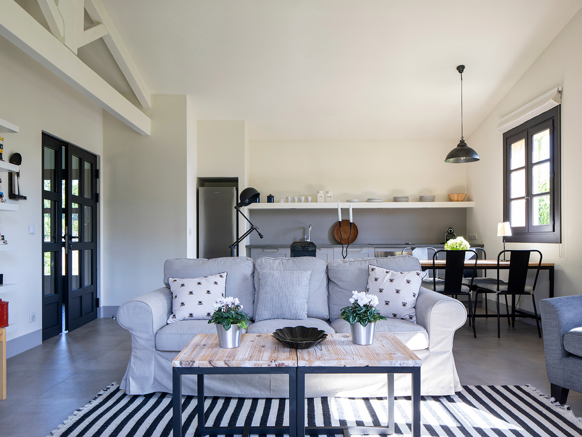 Daarnaast is er een ruime stijlvol ingerichte living en eethoek met volledig ingerichte keuken (incl. elektrische kookplaat, oven, ijskast en vaatwasmachine). Vanuit de living heeft u direct toegang tot de tuin en het zwembad.