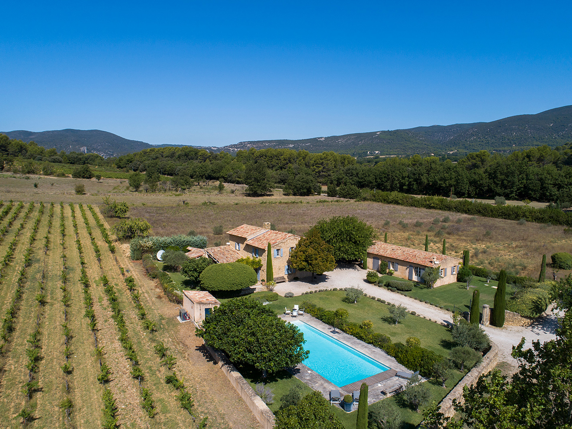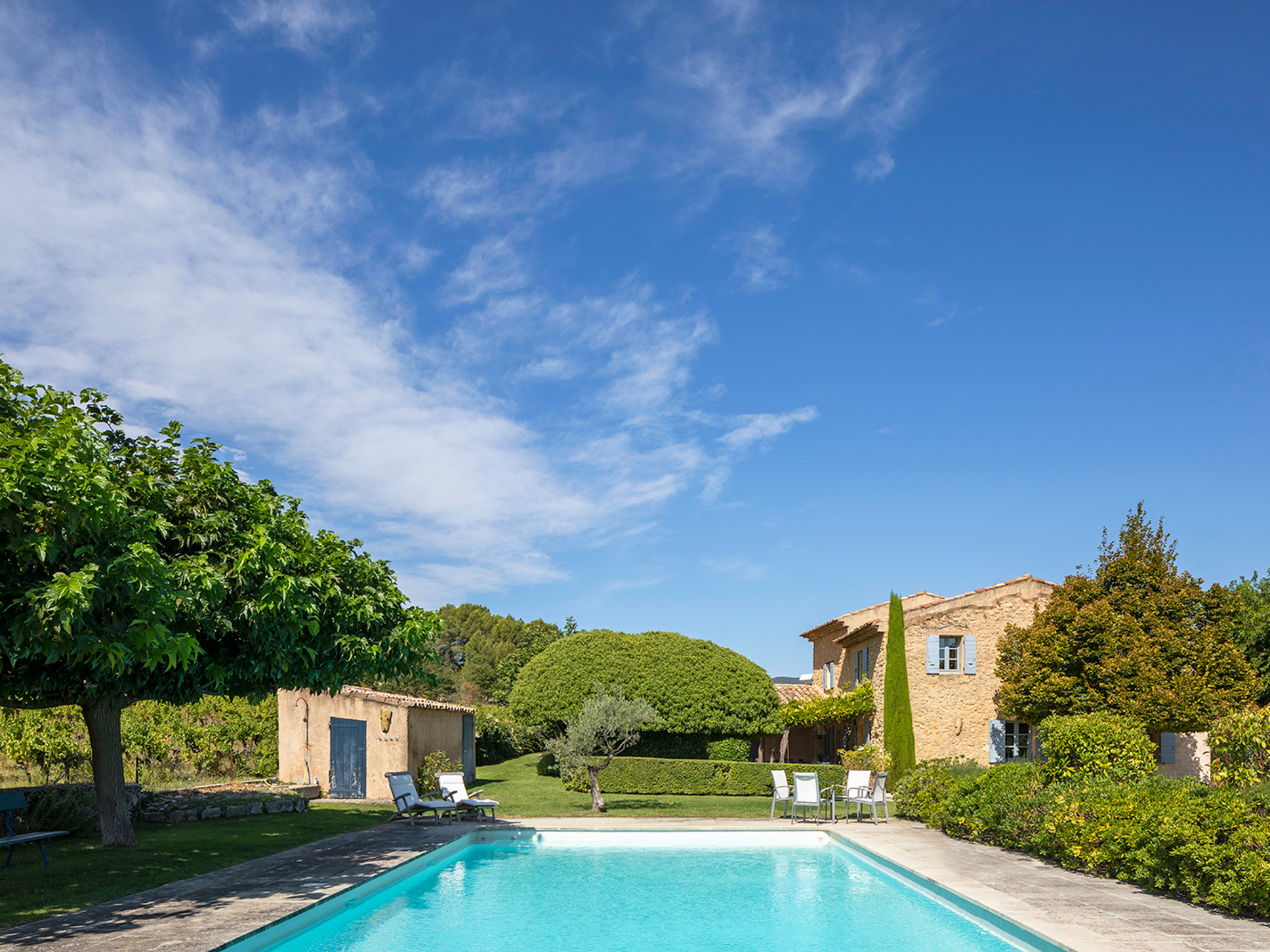 De villa is gelegen tussen de wijngaarden en het privé terrein meet 7000m2. Hier kunt u dan ook optimaal genieten van goede privacy!