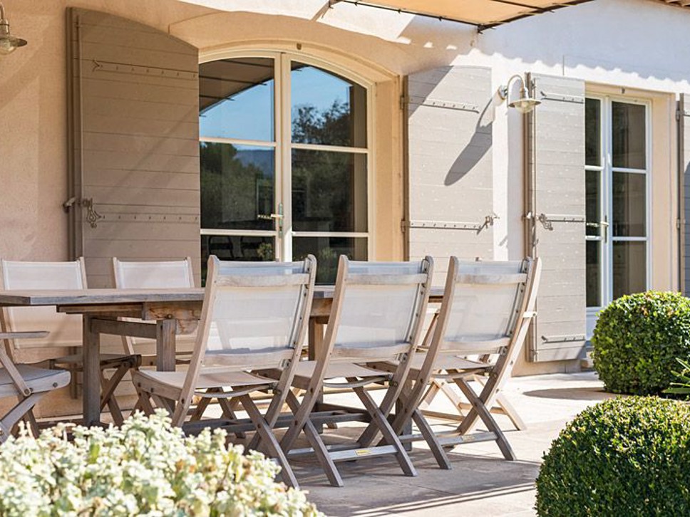Op het overdekte terras bij de openslaande deuren staat de buiten eettafel. Een heerlijke plek voor lunch of diner. Aan de andere zijde van het zwembad is het poolhouse gelegen met overdekt terras voorzien van een eettafel en een kleine buitenkeuken.
