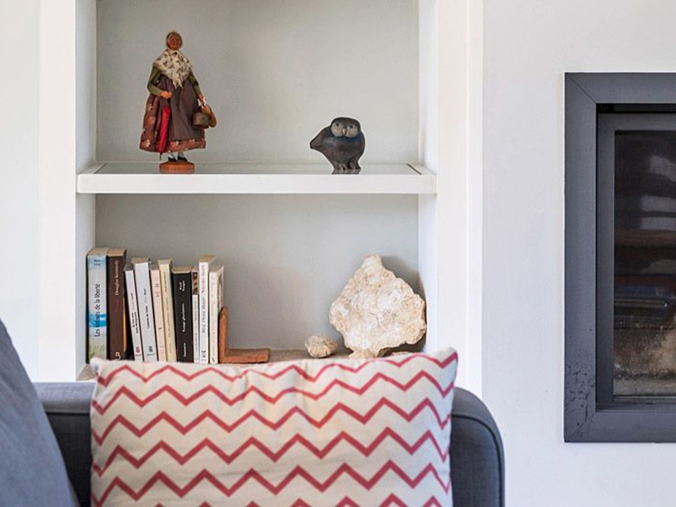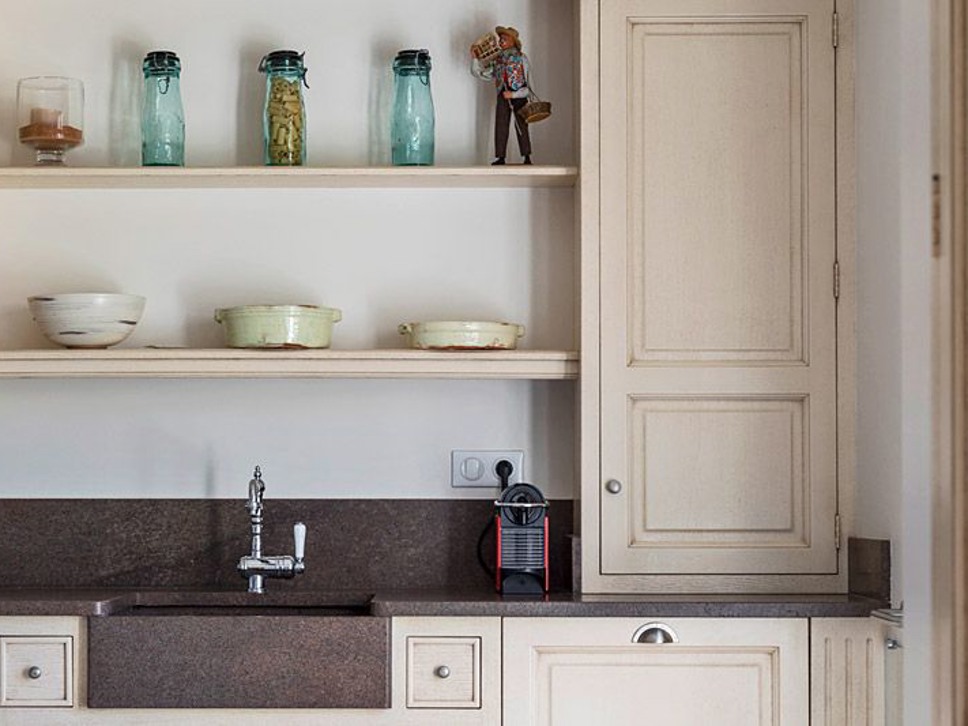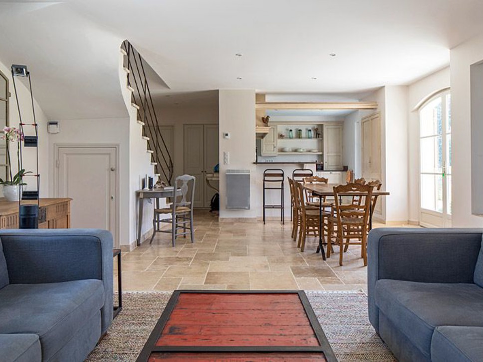 De living is ruim en bestaat uit een fraaie zithoek en een open keuken. De zithoek is gecentreerd rondom de haard en de TV. (LCD TV met Nederlandse en Belgische kanalen). De keuken is nieuw en voorzien van alle comfort waaronder grote Amerikaanse ijskast, inductiekookplaat, vaatwasser, waterkoker en oven. Vanuit de living openen 3 grote tuindeuren naar het gedeeltelijk overdekte terras. In de zomer staat daar de buiten eettafel.