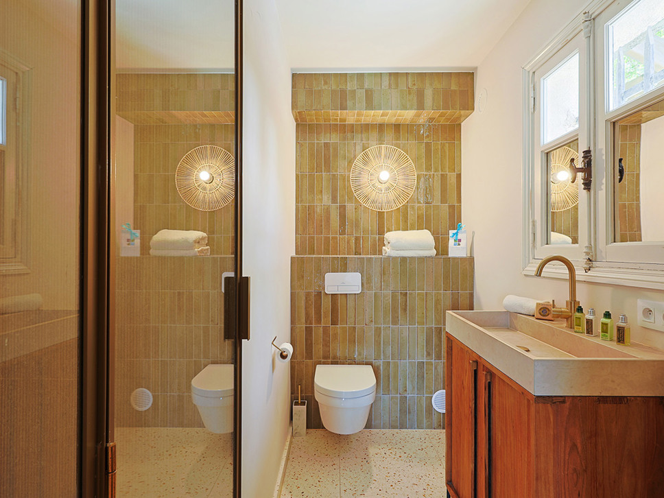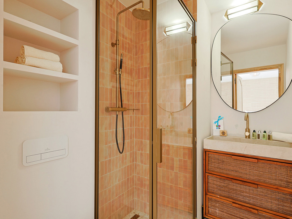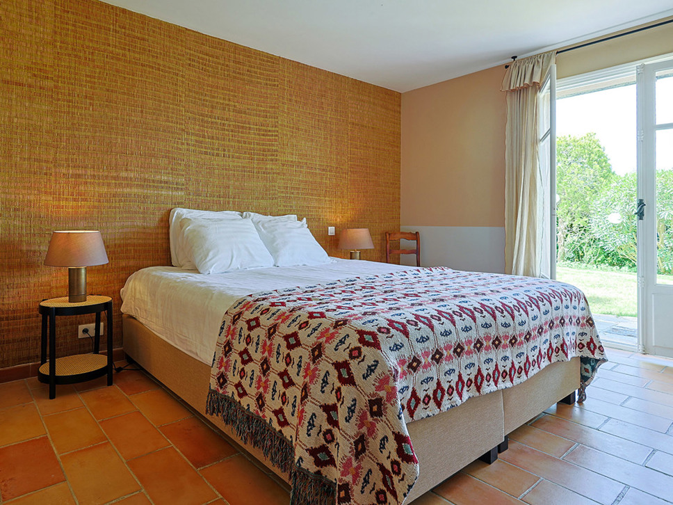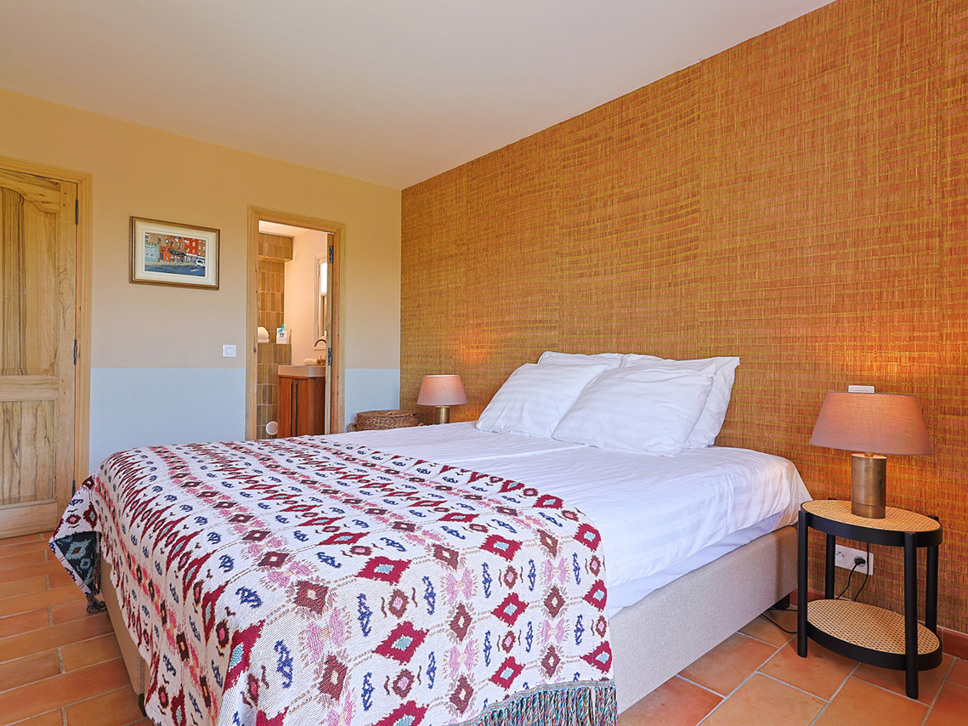 Slaapkamer 2: begane grond (zwembadniveau) biedt een tweepersoonsbed (180x210) met en-suite badkamer voorzien van douche en W.C.