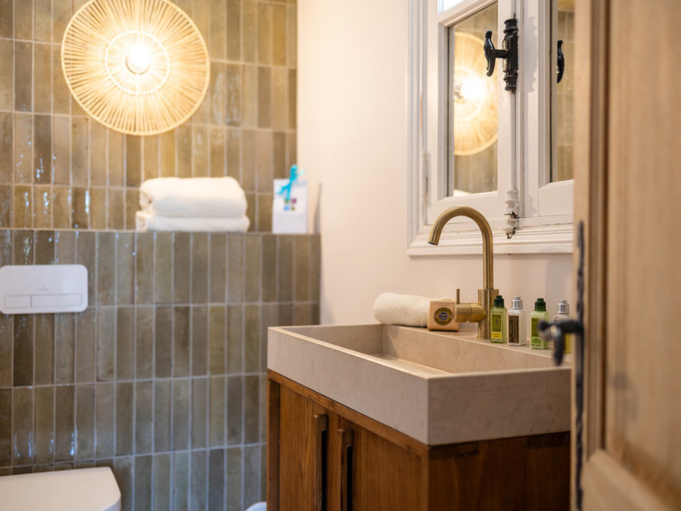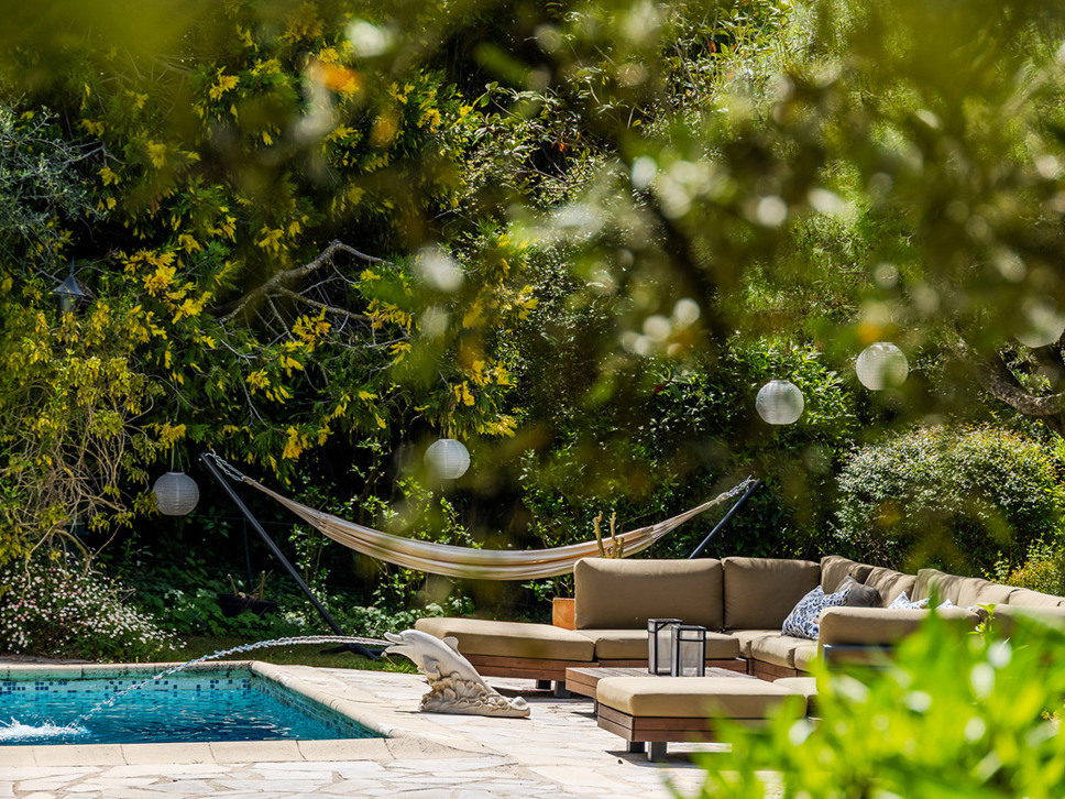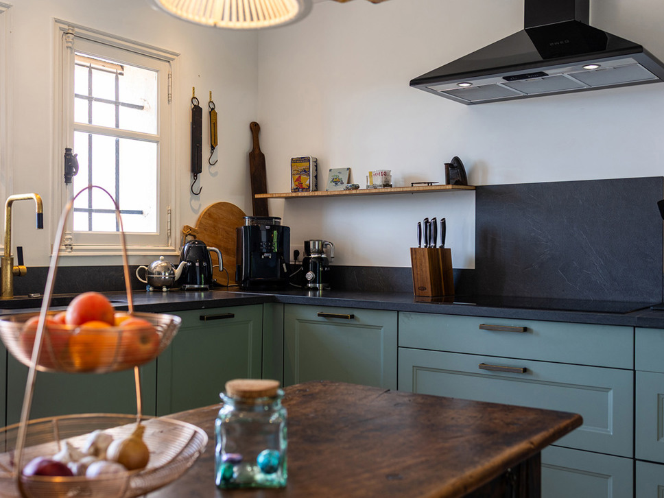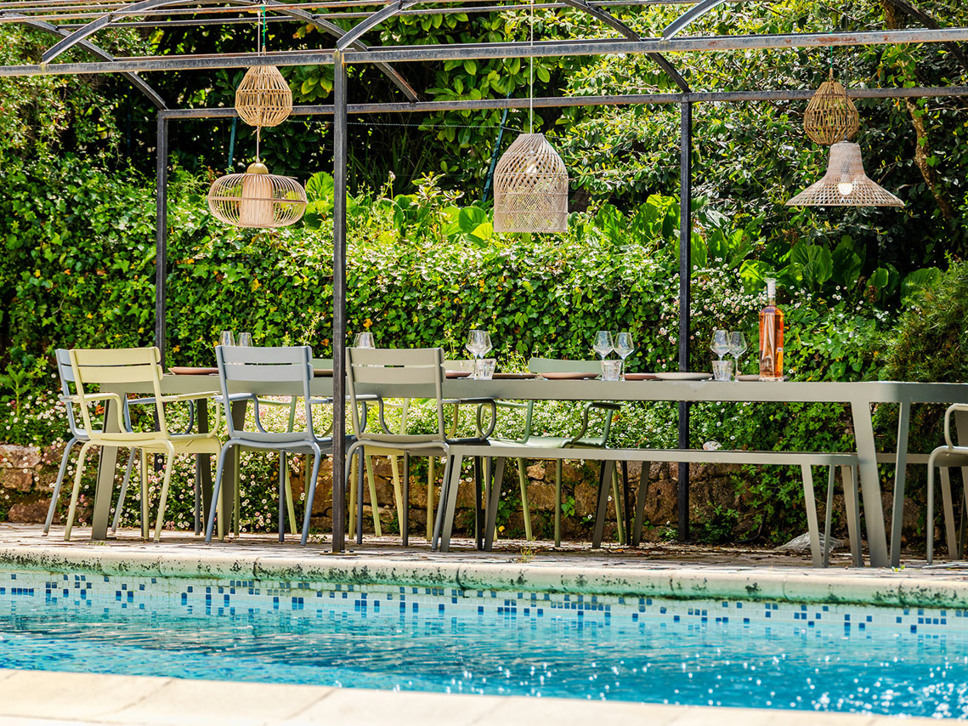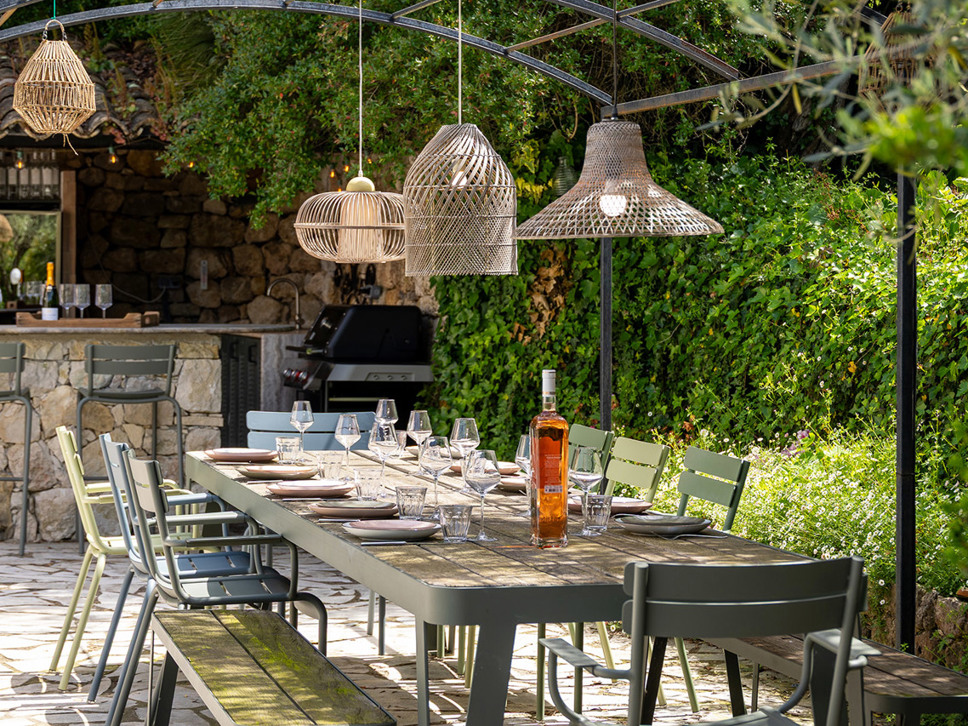 De zomerkeuken vormt het hart van het buitenleven op het niveau van het zwembad; voorzien van een bar en stoere gas BBQ. Aanpalend staat een XL eettafel (18 p) onder een begroeide pergola. 's Avonds zorgen subtiele lichtaccenten voor een sprookjesachtige sfeer – een mooi decor voor lange diners onder de sterrenhemel.