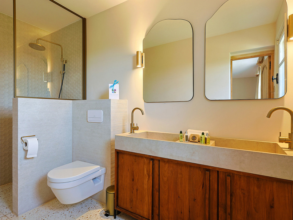 Bij aankomst op het bovenste niveau van de villa – tevens het woonniveau – ervaart u direct waarom dit huis zo bijzonder is. Hier leeft u letterlijk op hoogte, met als beloning een panoramisch uitzicht over de groene vallei. De sfeervolle living loopt via openslaande deuren over in een ruim, overdekt terras. Met een gezellige zithoek en eettafel wordt dit ongetwijfeld uw favoriete plekje voor een ontspannen apero of een goed boek in de schaduw.