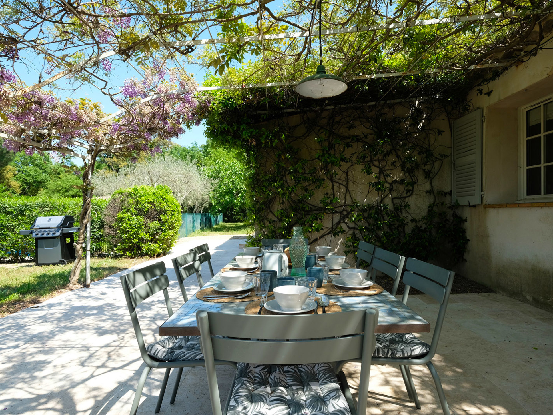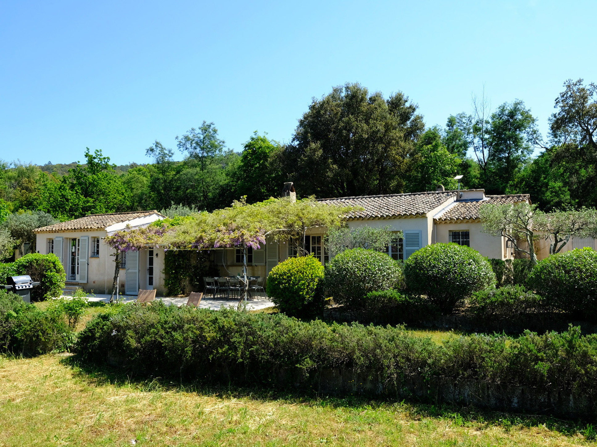 Rondom de villa vindt u meerdere terrassen, waarvan enkele sfeervol overdekt zijn met begroeide pergola’s. Zo is er voor iedereen een aangename plek in de zon of schaduw. Het hoofdterras ligt aan de keuken en beschikt over een grote eettafel, perfect voor lange, luie lunches en sfeervolle diners in de buitenlucht. De grote gas-BBQ staat ook op dit terras U geniet hier van het prachtige uitzicht op dorp Le Plan de la Tour en de wijnranken.
