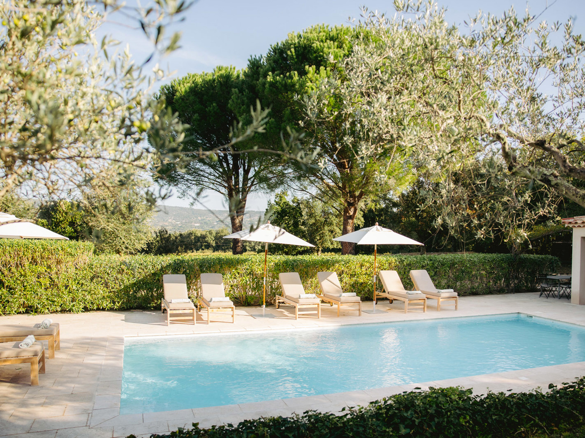 Grenzend aan het zwembad bevindt zich een ruim poolhouse met een heerlijke loungebank en stoelen, koelkast, kraan en spoelbak, een kleine keuken, eettafel en een aparte wc – een heerlijke plek voor een ontspannen gezellige lunch, een schaduwrijke pauze of genietend van de avondzon. Een fijne bijkomstigheid: het zwembad is volledig omheind, wat voor gezinnen met kinderen extra geruststellend is.