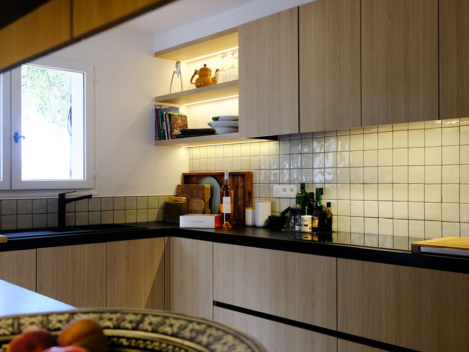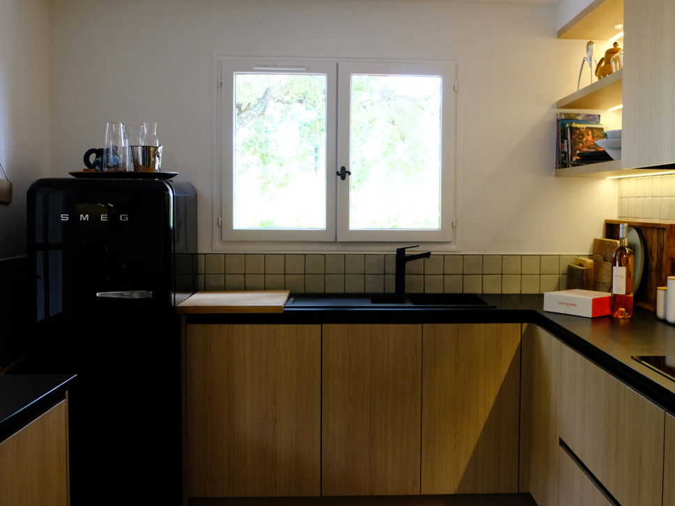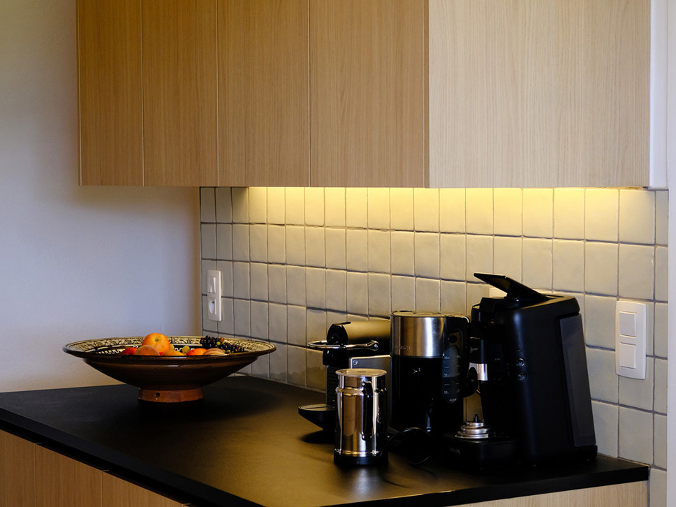 De keuken is modern en compleet ingericht. Vanuit hier heeft u toegang tot een 2e terras grenzend aan de wijngaard met een royale eettafel. Een wasmachine is voorzien in de bijkeuken.