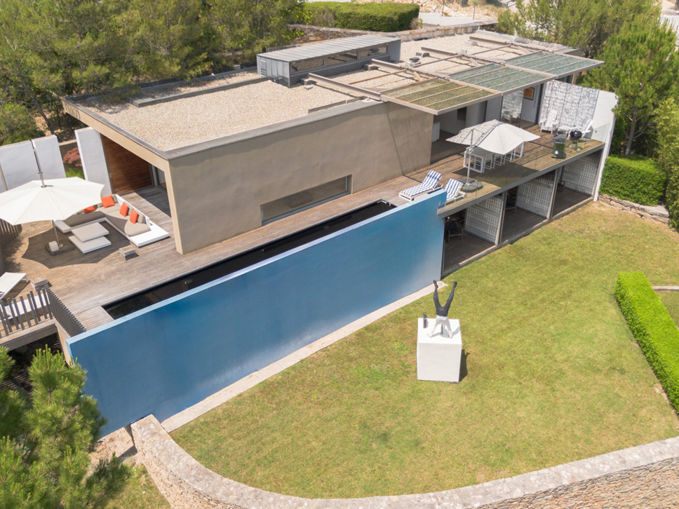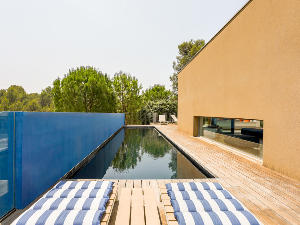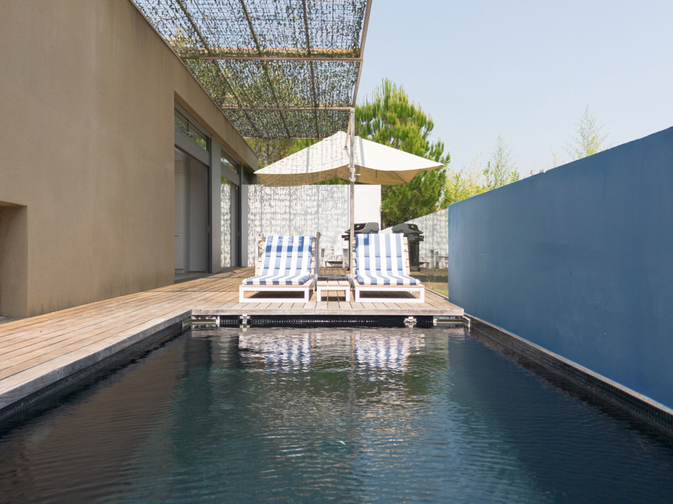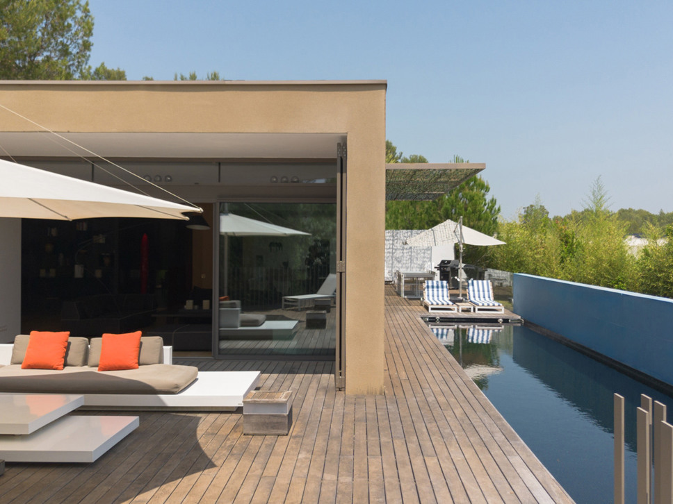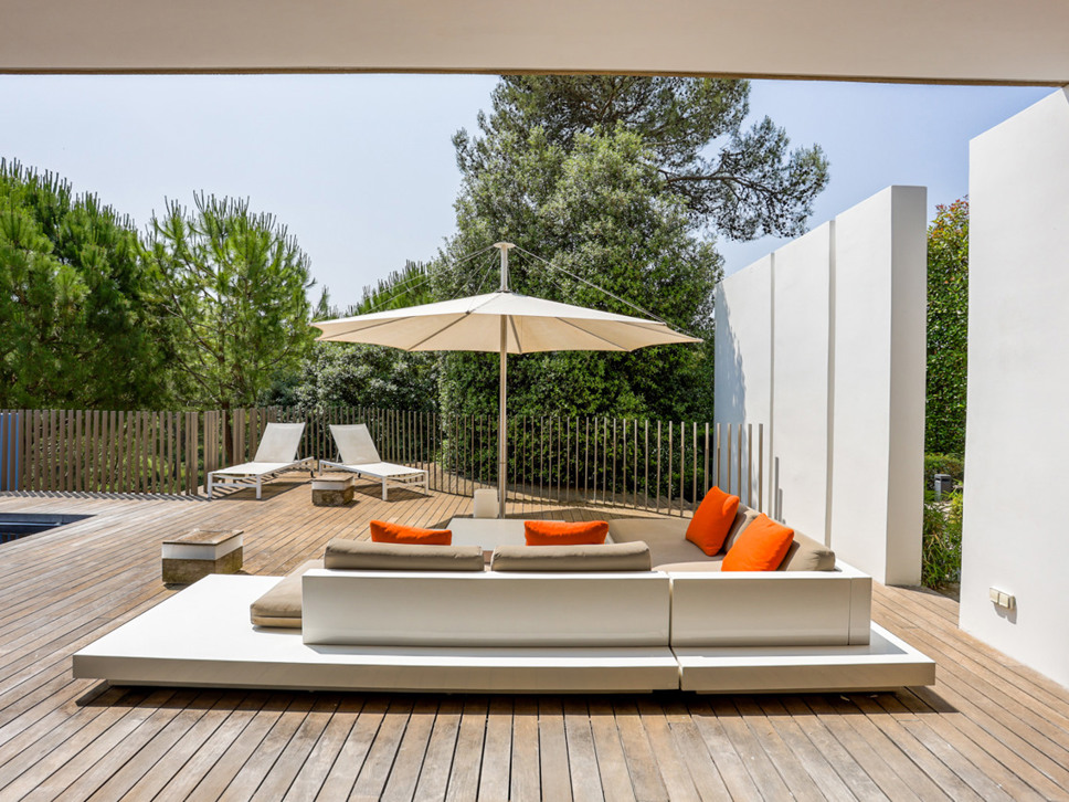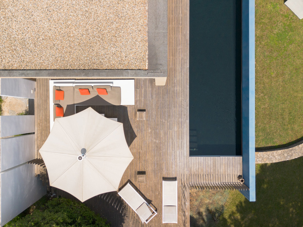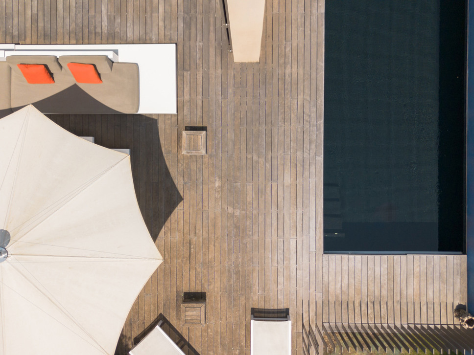 Het zwembad ligt op het niveau van de living en woonkeuken en de master bedroom. Het zwembad is zeer fraai verwerkt in het teakhouten terras. Op het terras staat een zeer luxe loungeset alsook een eettafel om heerlijk al fresco te kunnen genieten.