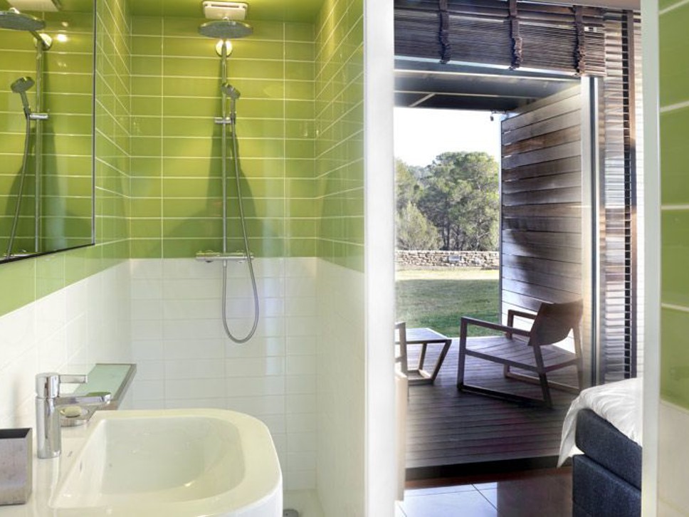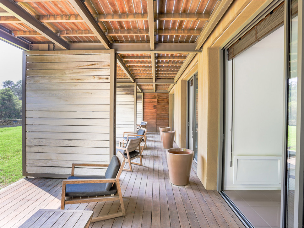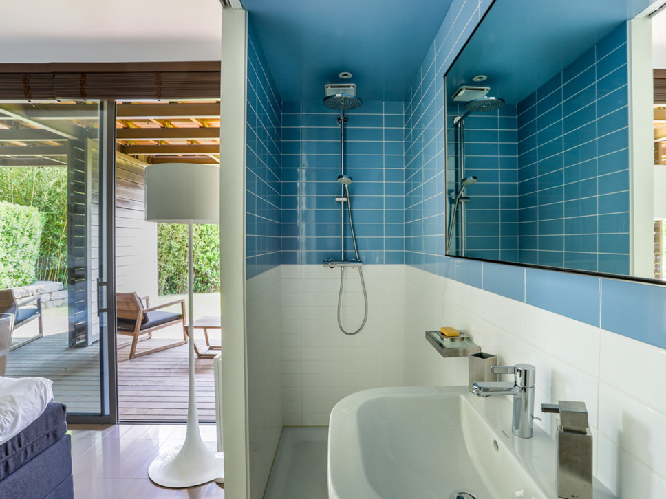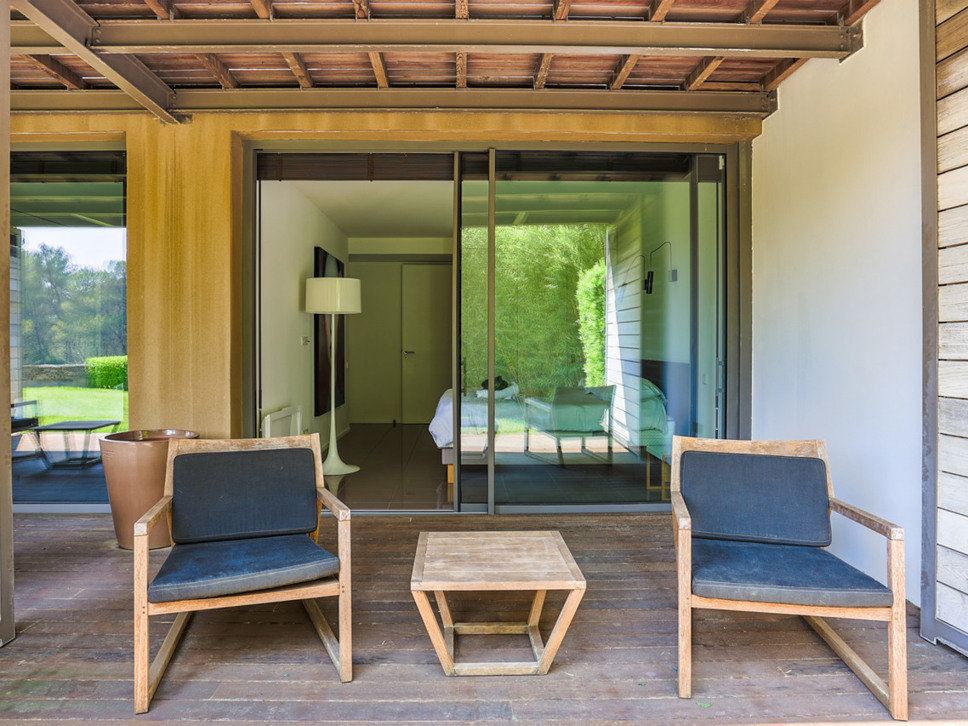 Alle drie de kamers hebben directe toegang tot een eigen houten terras. Een bijzonder detail is dat deze terrassen per slaapkamer met elegante houten panelen kunnen worden afgeschermd tegen de zon – een subtiele combinatie van privacy, comfort en design.