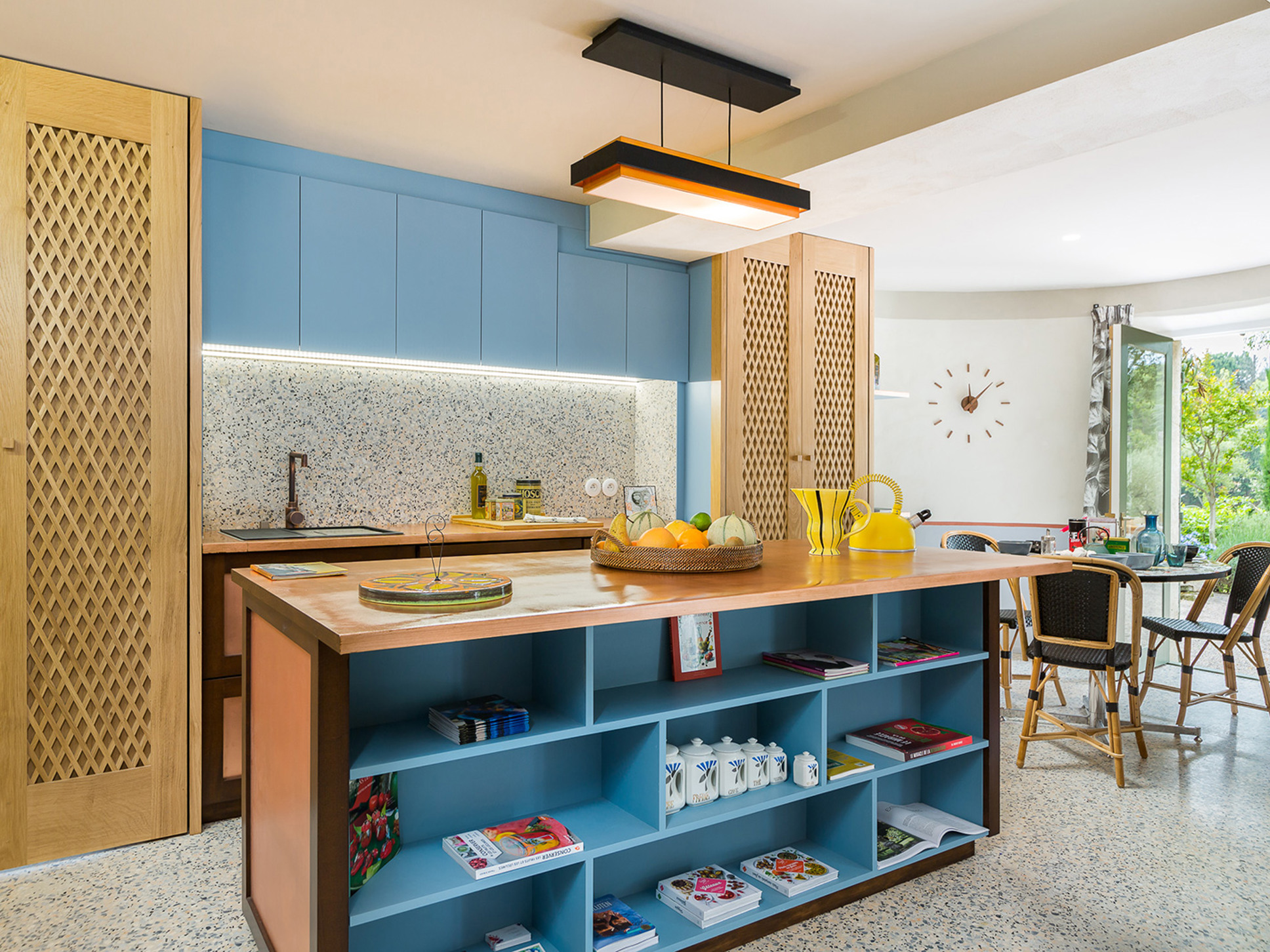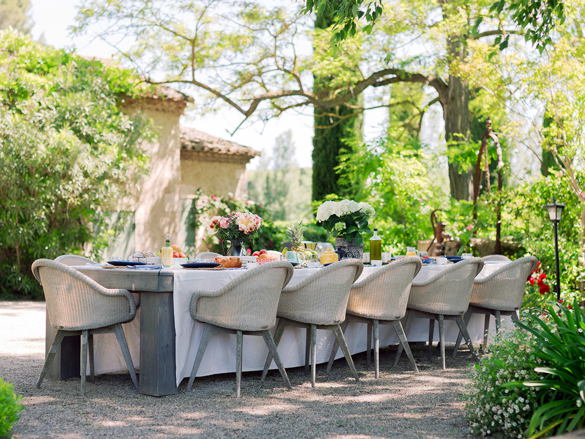 Er zijn vele zitjes met comfortabel tuinmeubilair, één ervan ligt direct voor het huis. Op dit kiezelterras vindt u ook een grote buitentafel om te kunnen genieten van een heerlijke lunch of diner. Heel praktisch, want deze tafel staat vlakbij de ingang naar de keuken.