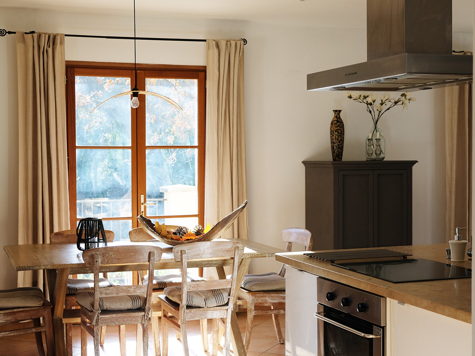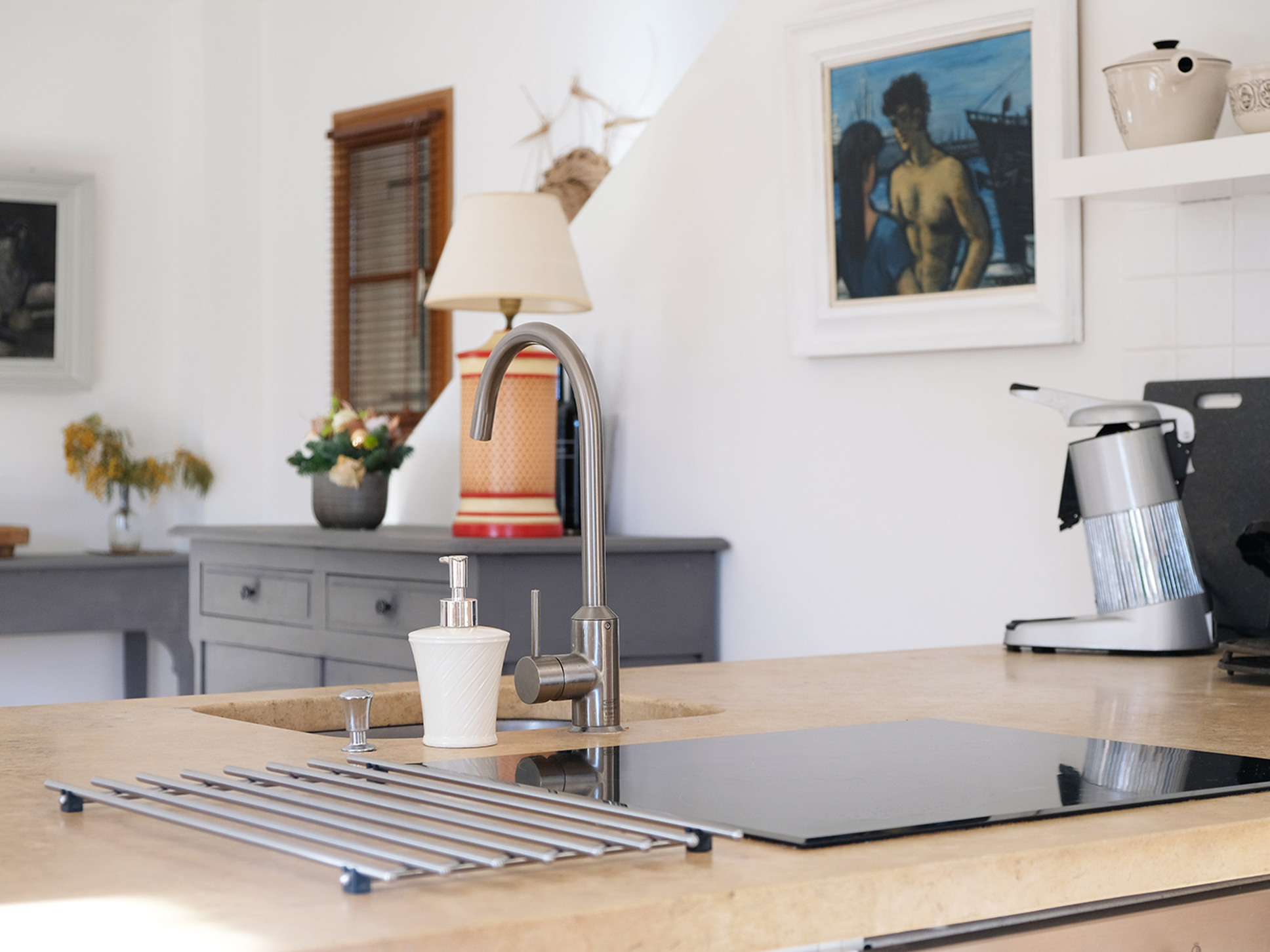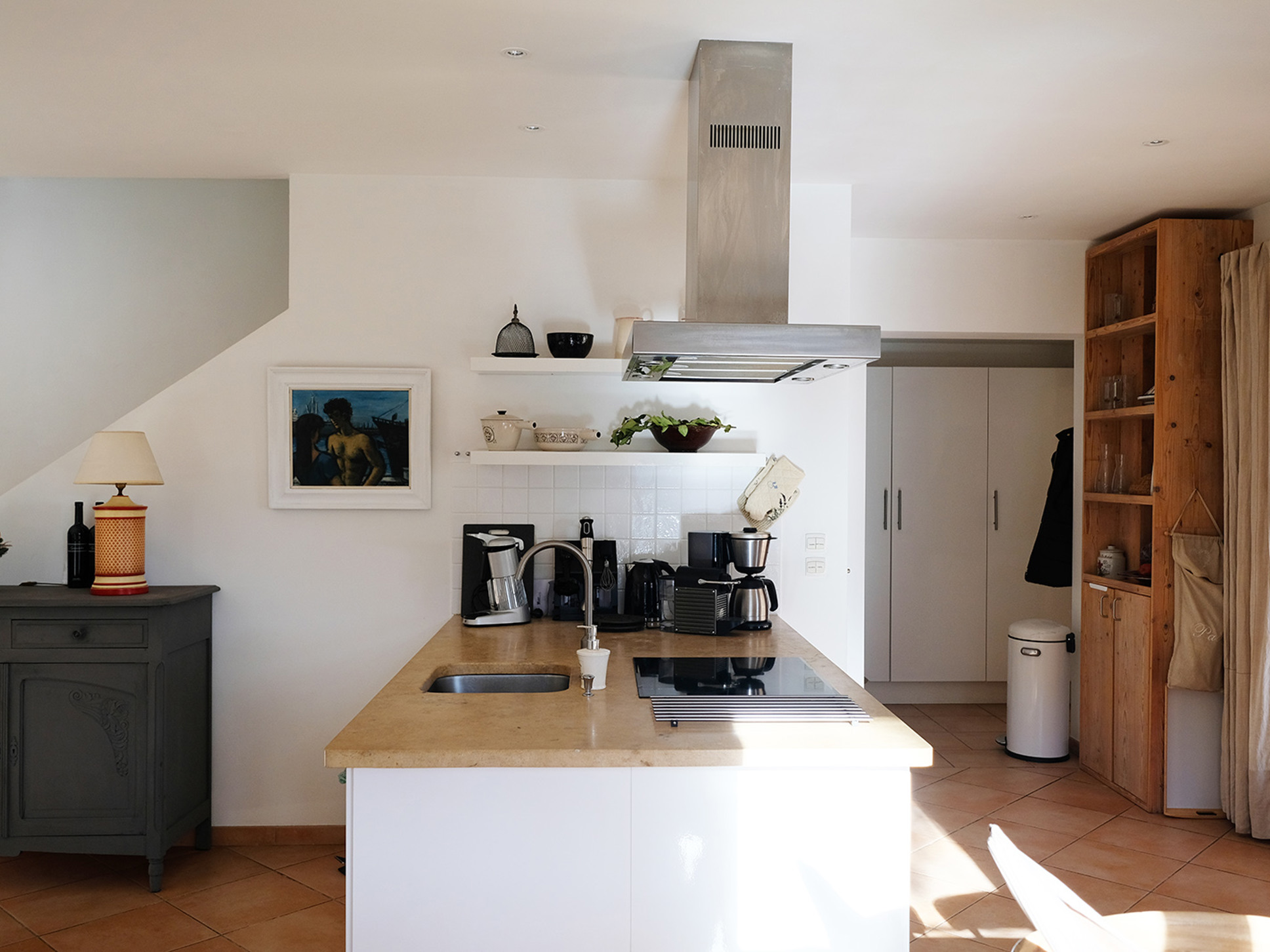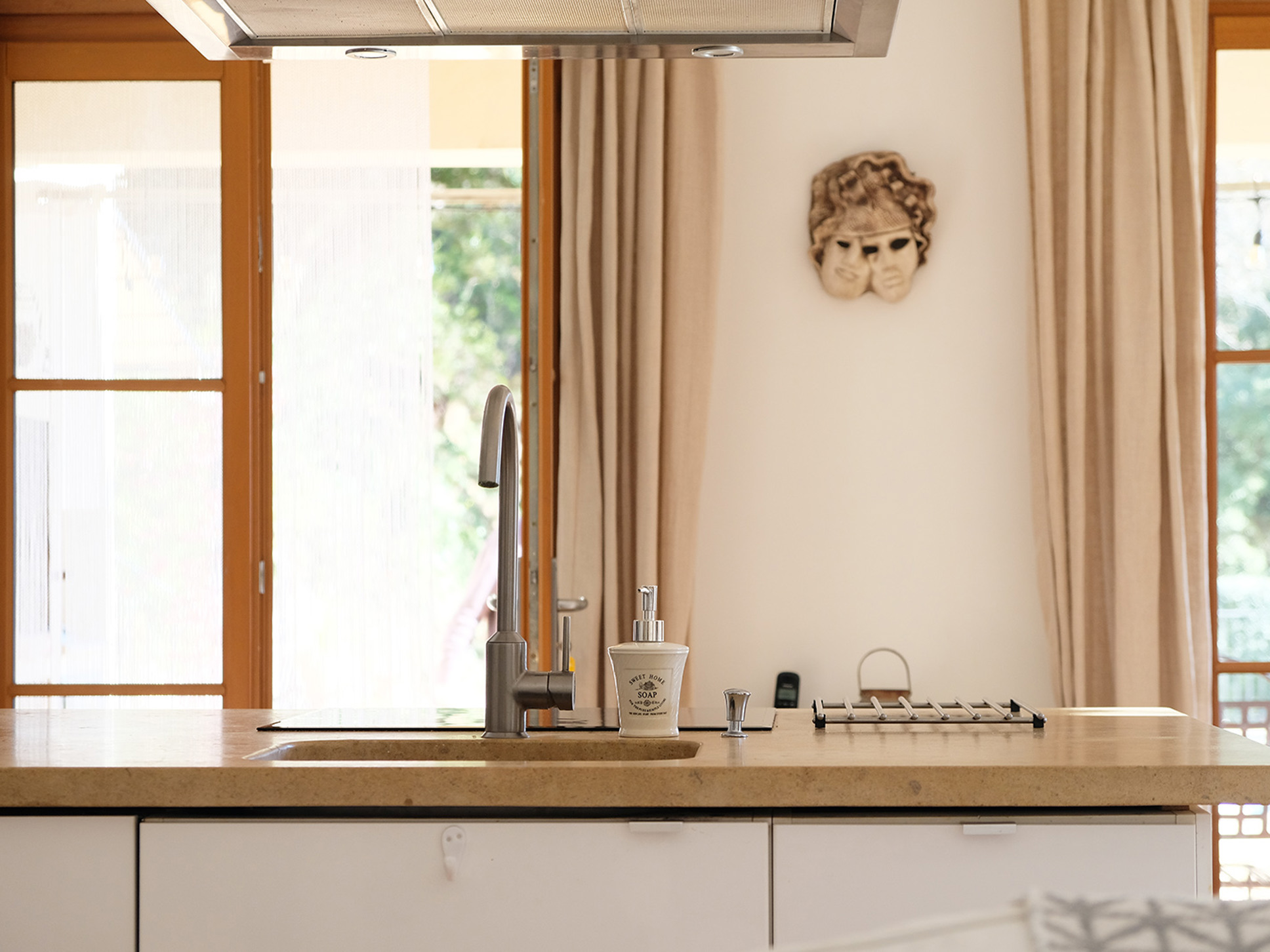 De moderne keuken is van alle gemakken voorzien, zoals een inductiekookplaat en vaatwasser, net als een broodrooster, waterkoker, koffiezetapparaat, Nespresso-machine (zelf cups meenemen svp) en koelkast. Fijn is dat u direct van deze open keuken zo het overdekte terras oploopt naar de eettafel en BBQ.