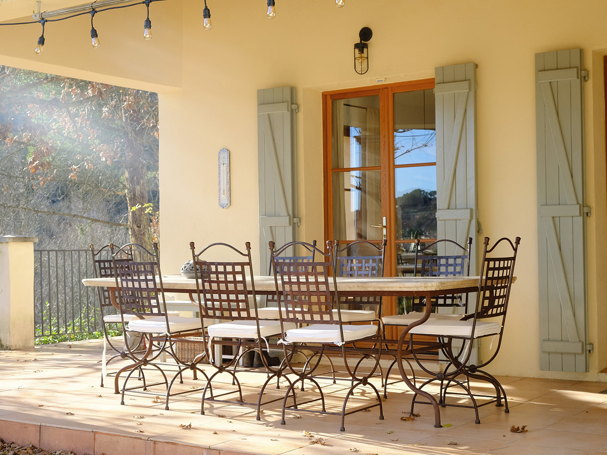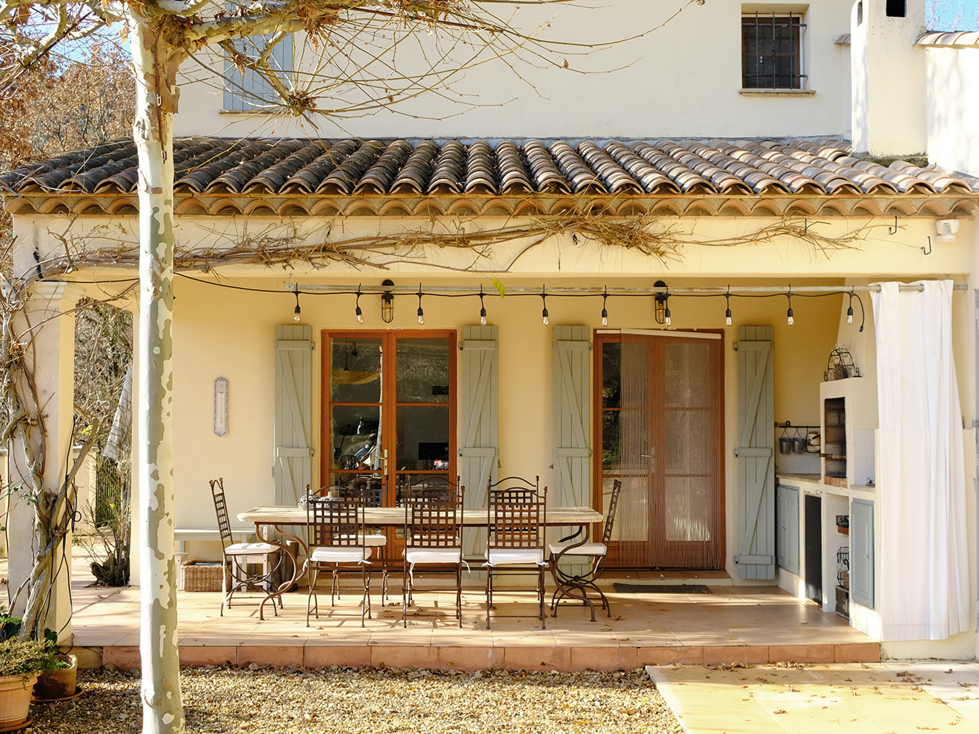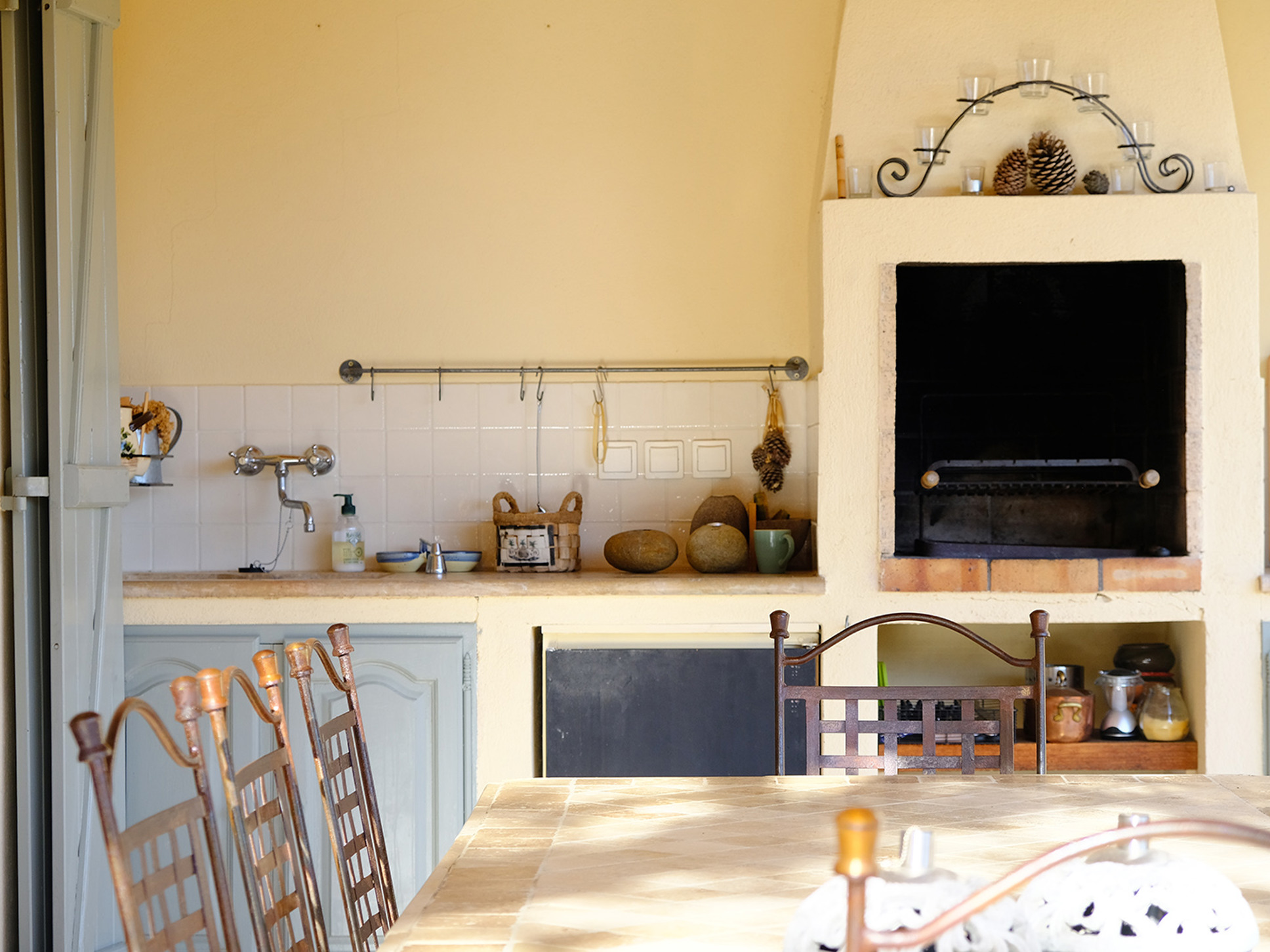 Wij zijn gecharmeerd van het overdekte terras met de grote eettafel en vaste BBQ. Een mooie plek om te genieten van Zuid-Franse lunch of BBQ.