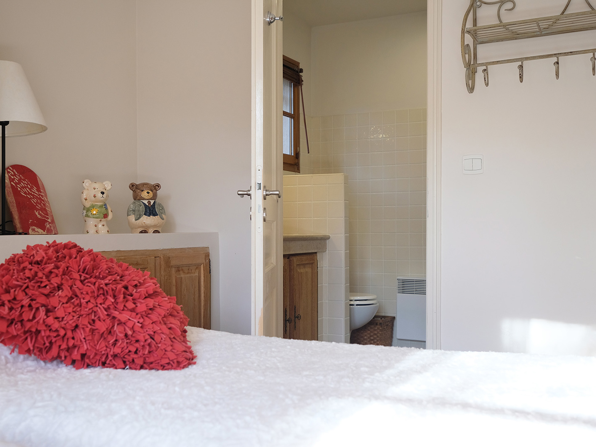 Slaapkamer 1 gelegen rechts van de entree biedt een tweepersoonsbed (180x200) en een privé badkamer (douche en WC).
