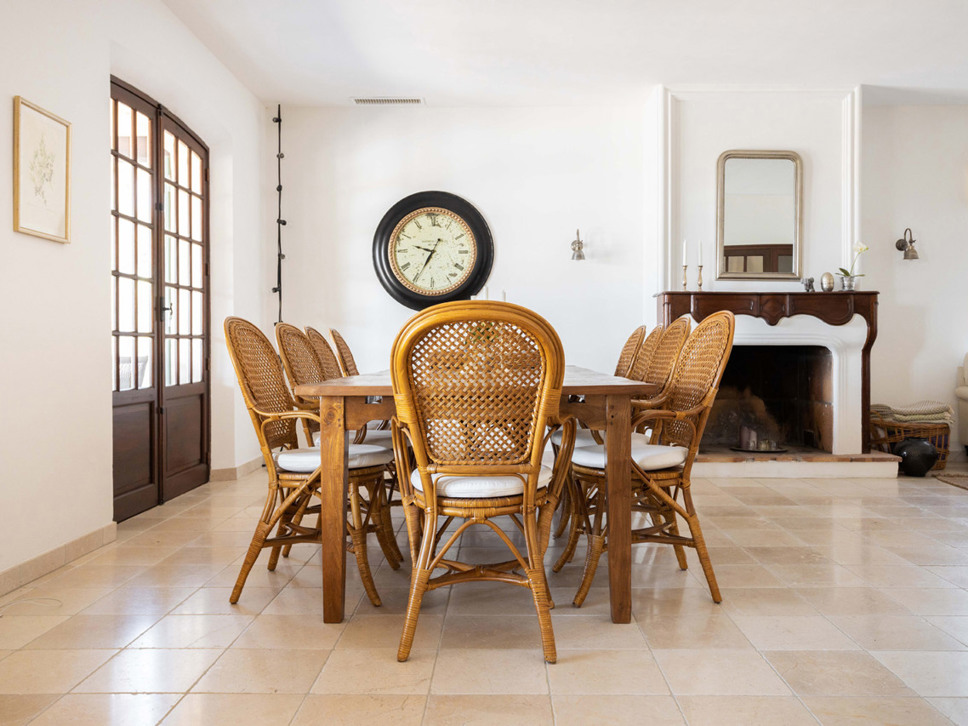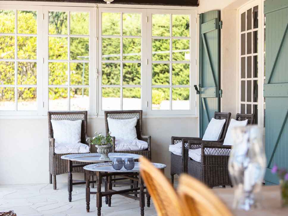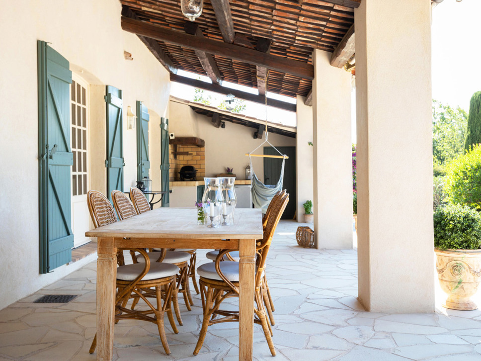 Vanuit de living bieden openslaande deuren naar het royale gedeeltelijk overdekte terras. Daar staat een eettafel met 8 zitplaatsen en enkele buitenmeubelen.