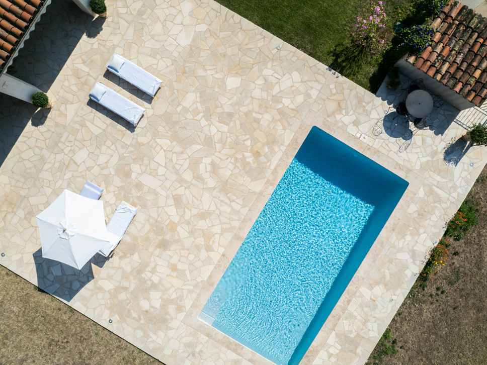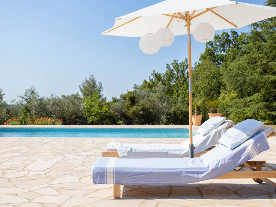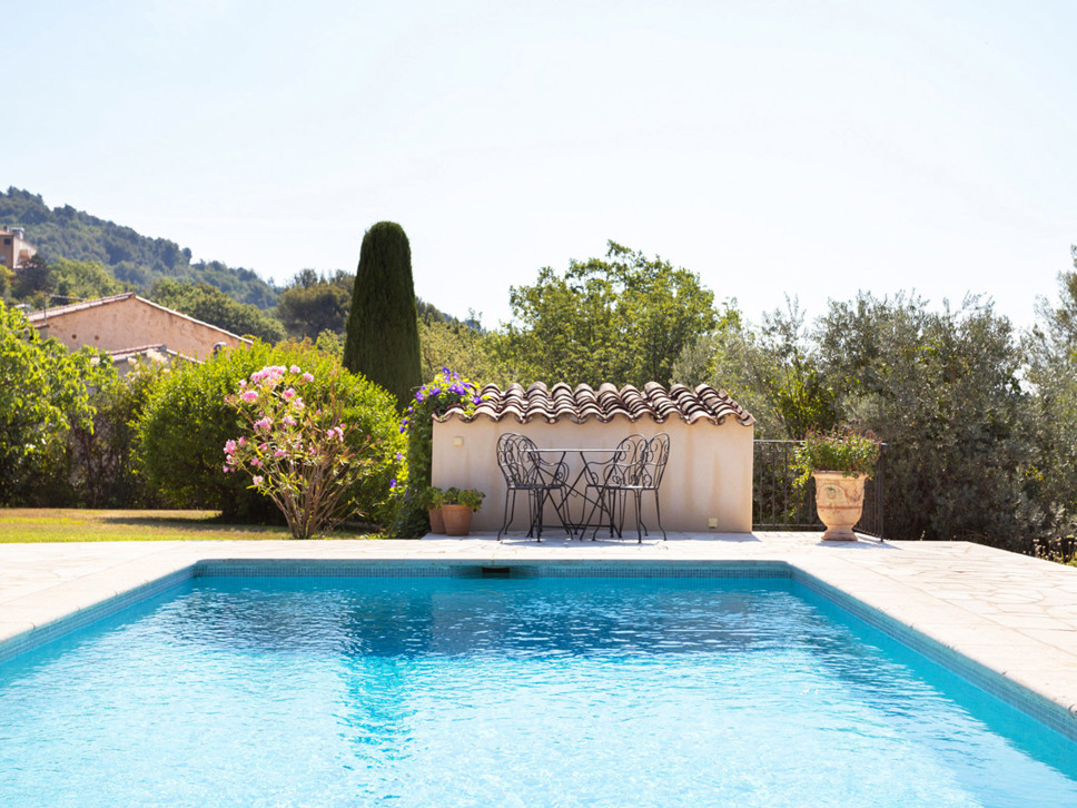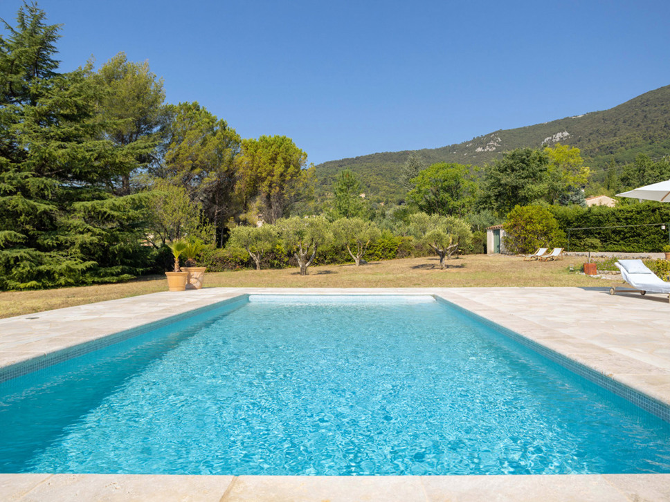 Het zwembad ligt direct voor de villa en meet 8 x 4 m. Er zijn ligstoelen en parasols aanwezig. Vanaf het terras, zwembad en tuin is fraai en breed zicht op de Provençaalse heuvels.