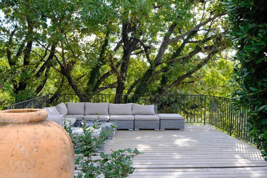 In de tuin zijn diverse zitjes gecreëerd. Op het terras dat grenst aan de living staat een grote eettafel met tien stoelen onder een rieten overkapping, waar het heerlijk vertoeven is. Het zwembad (4 x 10 m) ligt op ongeveer 15 meter van de villa en kan op aanvraag (tegen toeslag) worden verwarmd. Bij het zwembad vindt u een zomerkeuken met ijsmachine en koelkast, acht (lig)stoelen en een gasbarbecue. Verder beschikt het terrein over een ruime jeu-de-boulesbaan en een tafeltennistafel.