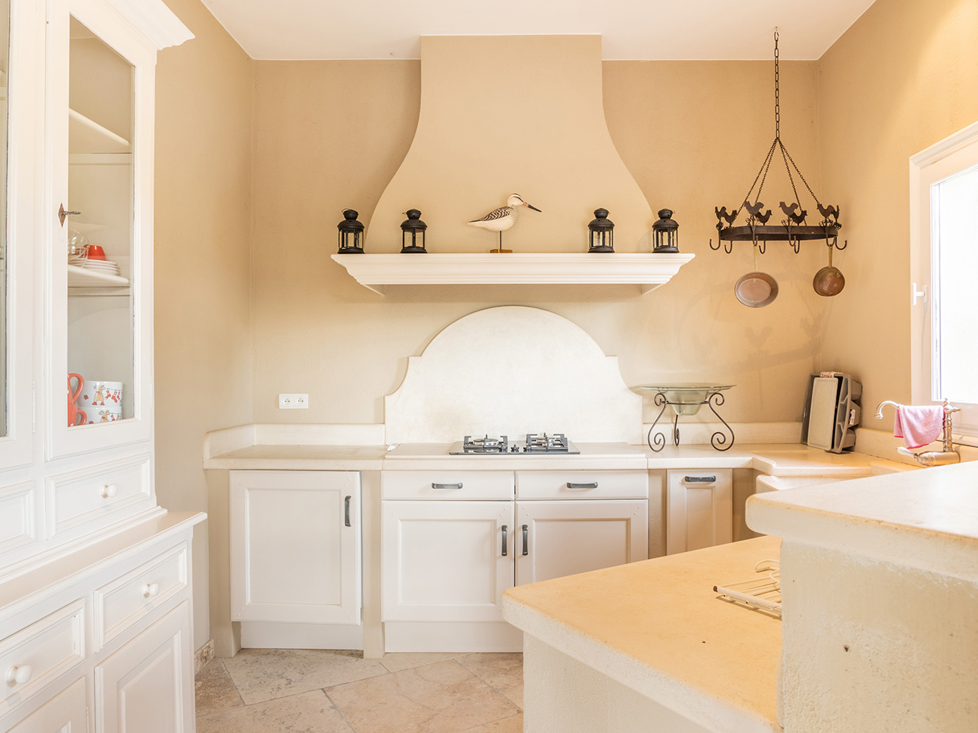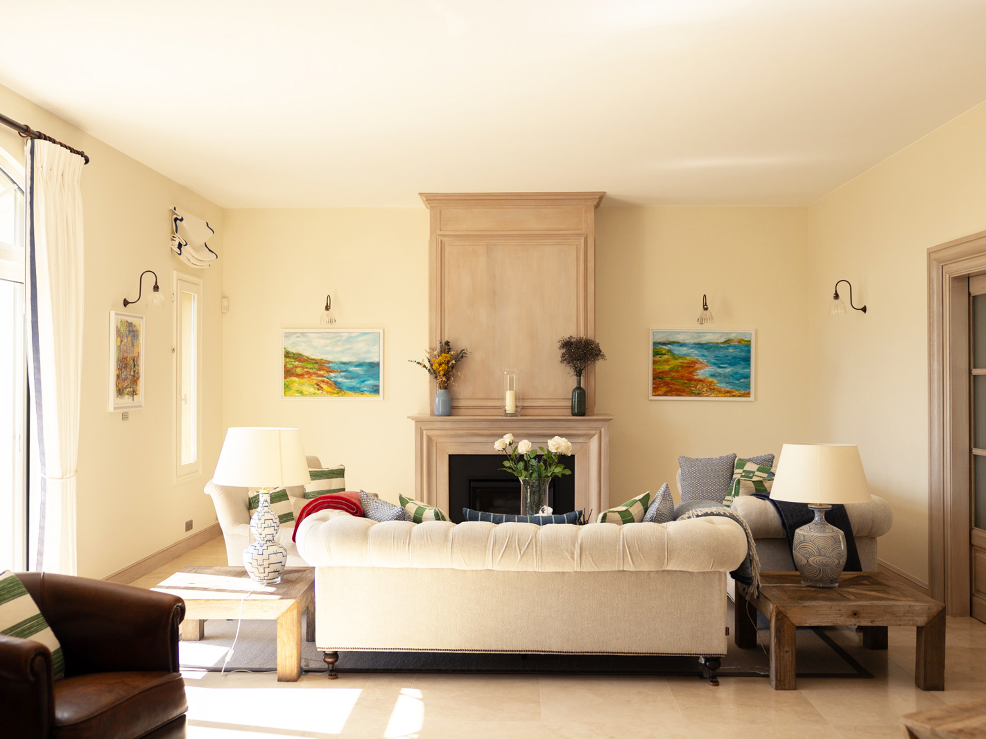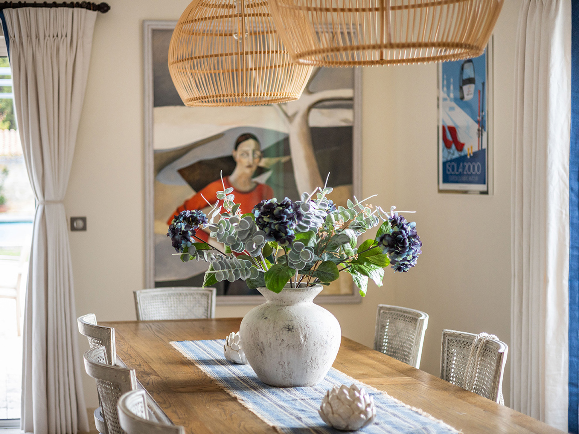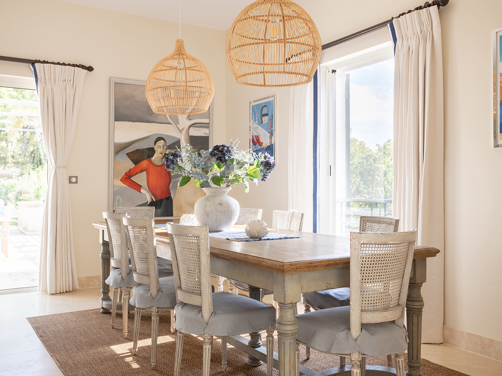 De living is sfeervol en voorzien van modern zitmeubilair met een focus op de open haard, erg leuk om te gebruiken tijdens het voor- en naseizoen. Grote ramen zorgen voor veel licht inval en een prachtig zicht over de Provençaalse campagne. In het verlengde van de living en verbonden met de grote open keuken is de eetkamer met een ruime eettafel met 8 stoelen.