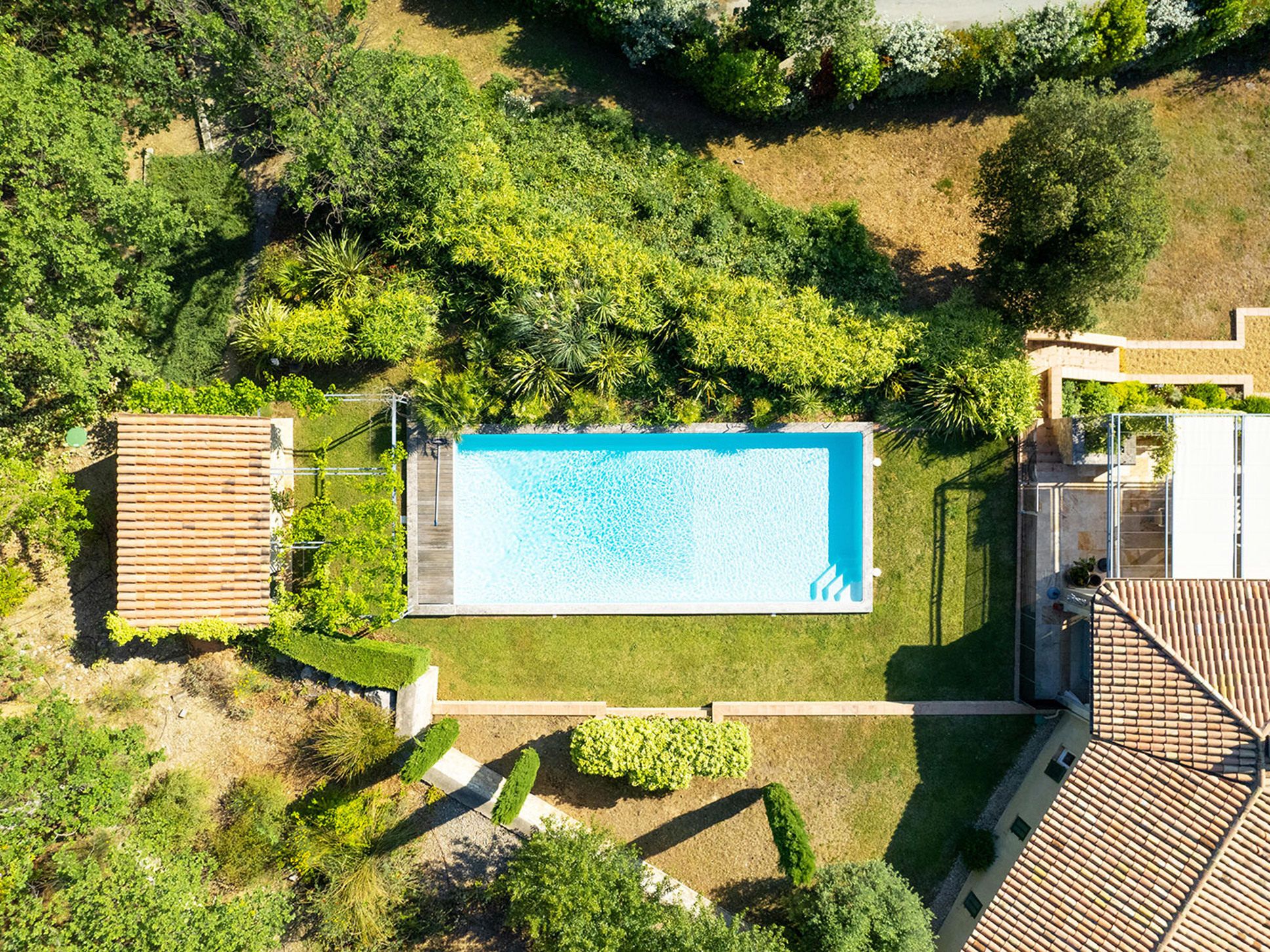Het zwembad, 15 x 6 m ligt op korte afstand van de villa ingesloten tussen een ruime border met Mediterrane planten aan de ene kant en het grasveld an de andere kant. Perfect voor de kinderen om lekker te spelen. Het zwembad is afdekbaar met een mechanisch roldek. Parasols en ligbedden voor aan het zwembad zijn uiteraard aanwezig. Er is ook een jeu de boules baan.