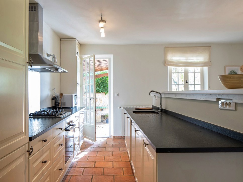 Zowel de living als de keuken bieden toegang tot het L-vormige terras wat zich over de gehele breedte van de villa strekt. Zo treft u hier o.a. enkele lounge stoelen om, met een lekker glas rose, van het uitzicht te kunnen genieten.