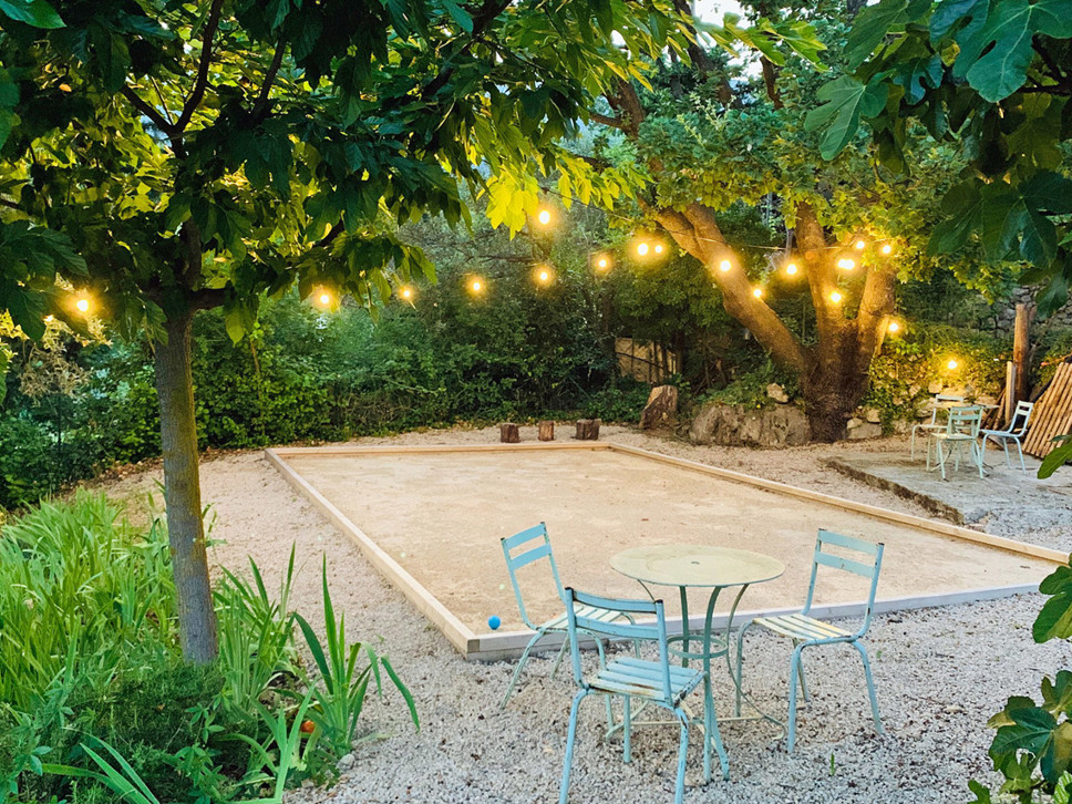 De tuin is vlak en biedt kinderen volop ruimte tot spelen. Ook is er een 'Jeu de Boules baan' op het middelste terras in de schaduw van een grote eikenboom, tevens treft u hier een houten terras en pergola. Geniet van een typische Frans spel met het hele gezin!
