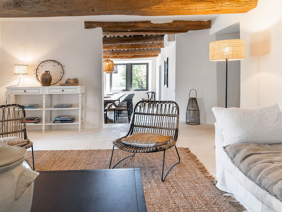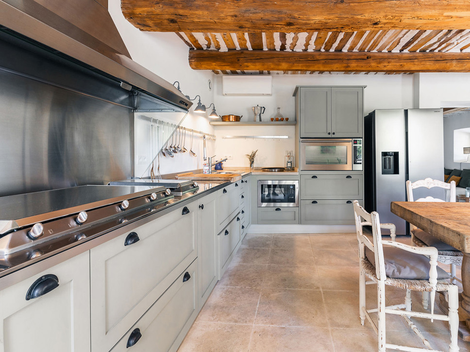 Op de begane grond van de Bastide vindt u een royale living met twee comfy linnen banken en fauteuils, een volledig uitgeruste keuken met een gasfornuis, Amerikaanse koelkast/vriezer, grote oven, magnetron, stenen werkblad, 3 wastafels en een grote oude houten eettafel met Provençaalse stoelen. De keuken opent naar 2 eetkamers met twee grote eettafels. Zie hiervoor ook de foto’s.