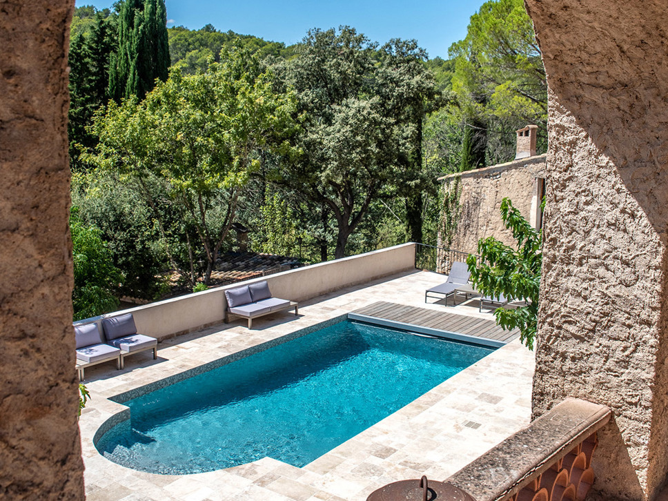 Het zwembad bevindt zich een niveau lager. U komt daar via de trap vanaf het overdekte terras. Het zwembad meet 10,5 x 4,5 m. De diepte is aflopend tot 1.90 m. Rond het zwembad zijn verschillende ligstoelen en parasols te vinden om van de Franse zon te kunnen genieten.